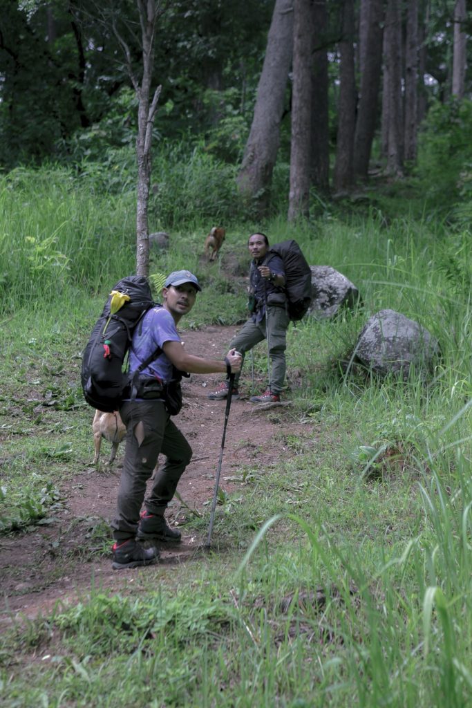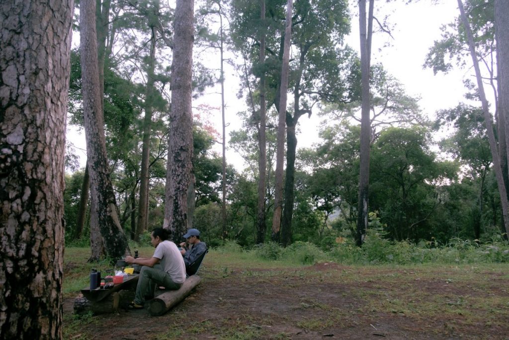 บริเวณลานกางเต็นท์แวดล้อมไปด้วยต้นสน หลังจากหาทำเลกางเต็นท์เป็นที่เรียบร้อย ก็พักนิดนึง