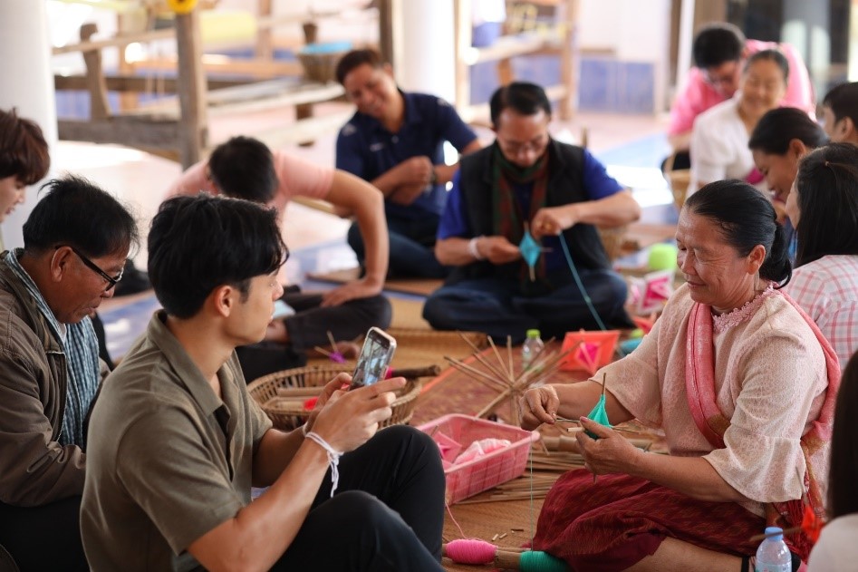 การเดินทางไปในตัวชุมชนไม่ไกลจากลานกิจกรรมมากนัก กิจกรรมที่เราได้ทำจุดแรกคือ สาธิตทอเสื่อกก เรามีโอกาสได้ดูแม่ ๆ ทำและได้ลองทำเสื่อกก โดยเสื่อกก ทำจากต้นกก ที่นำมากรีดให้ได้เส้นบาง ๆ และย้อมสีสันตามที่ต้องการ หลังจากนั้นก็เข้าสู่กระบวนการของการทอเสื่อกก ซึ่งลาดลายเป็นลายดั่งเดิม หรือเรียกเป็นภาษาอีกสานว่า ลายบักจับ นอกจากนี้ยังมีลายลูกหวาย ลายดาวพระศุกร์ มีความยากและการจำสูง ทั้งการจำลวดลาย และการสอดไม้สอดกก