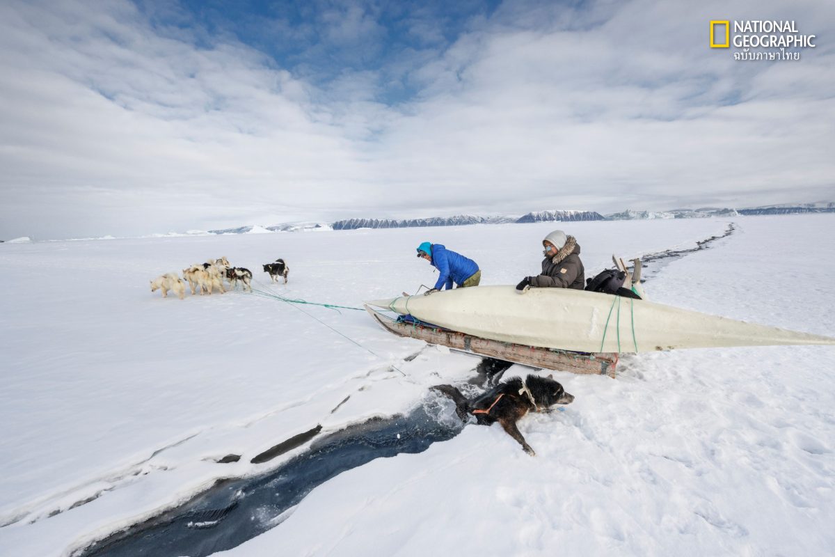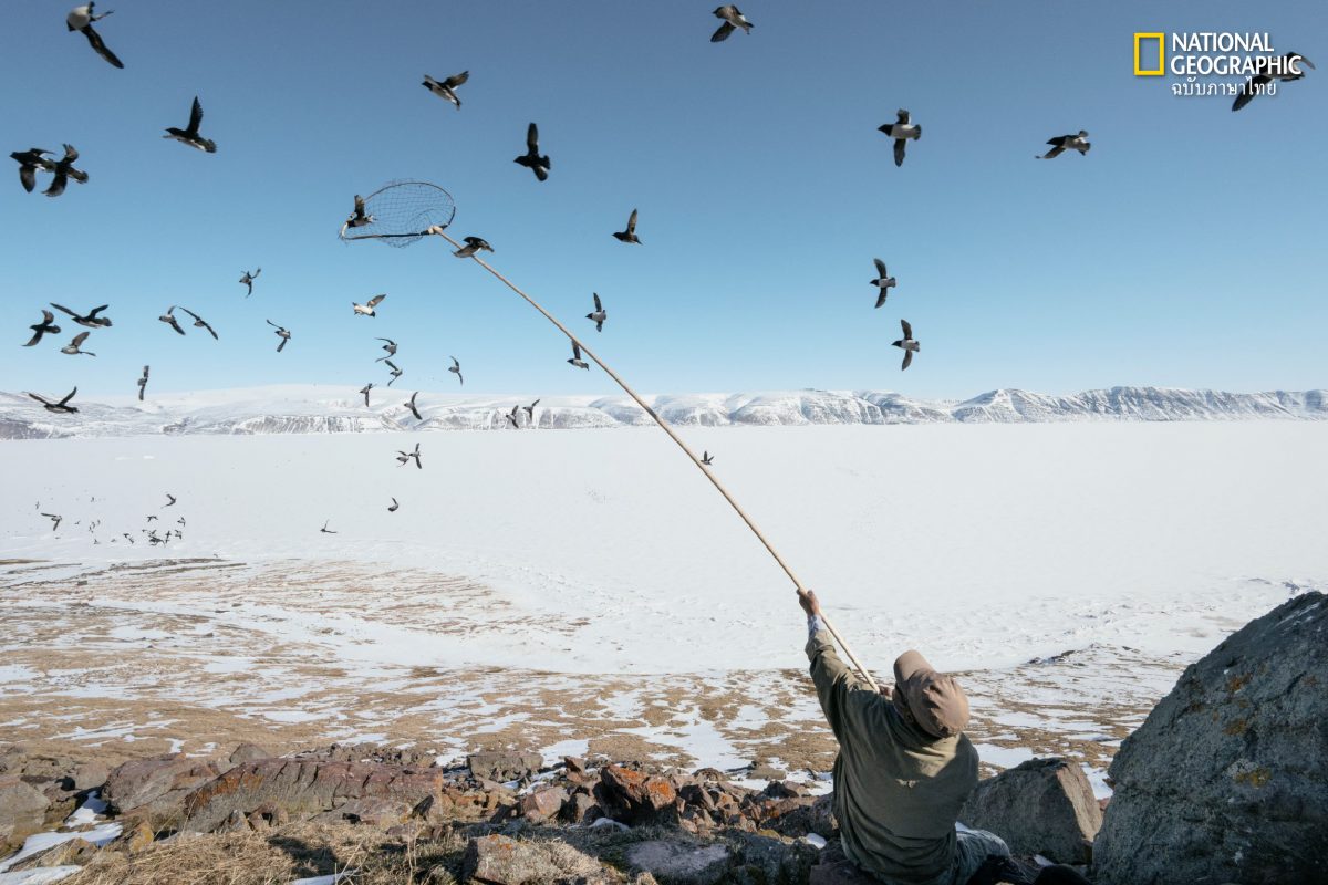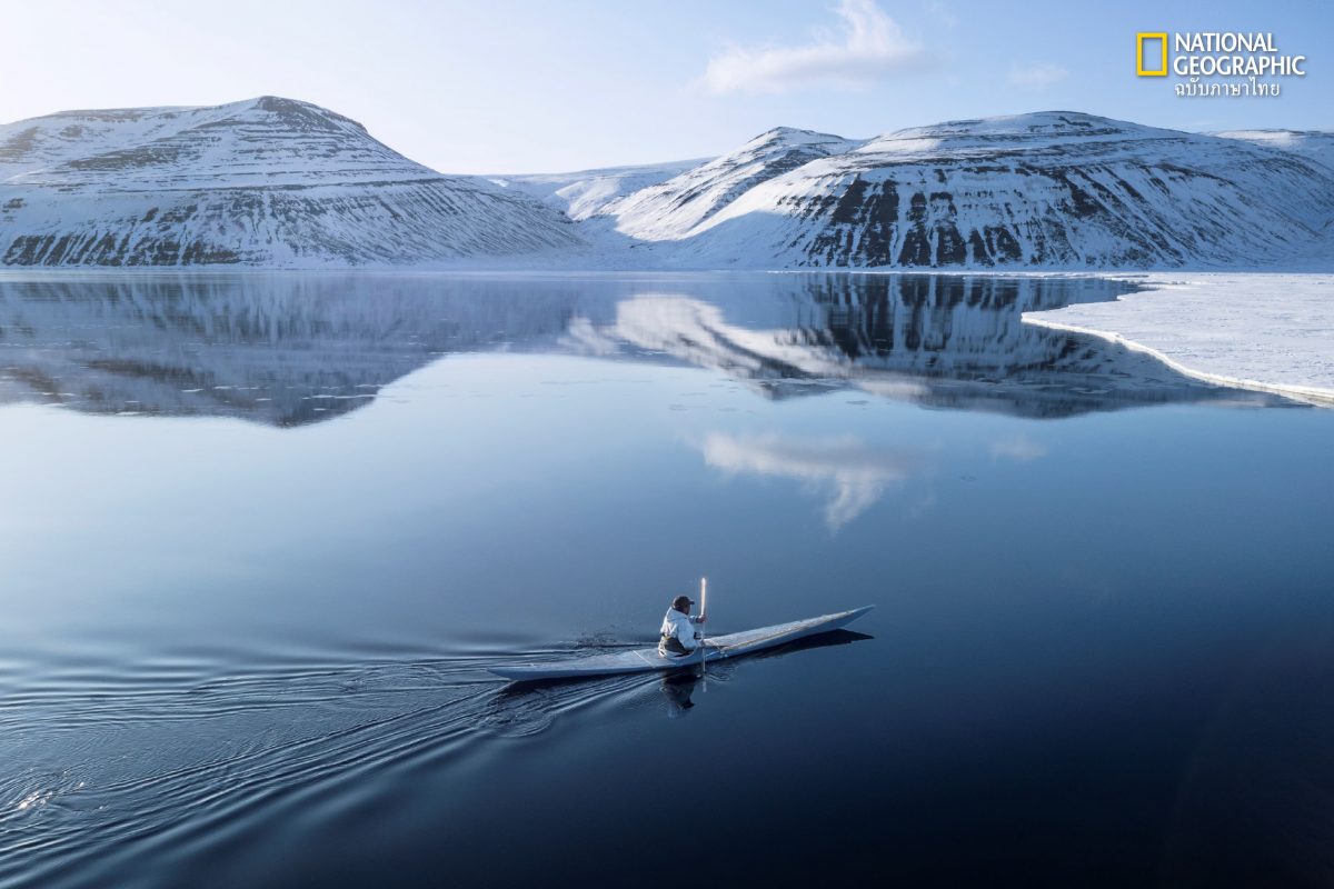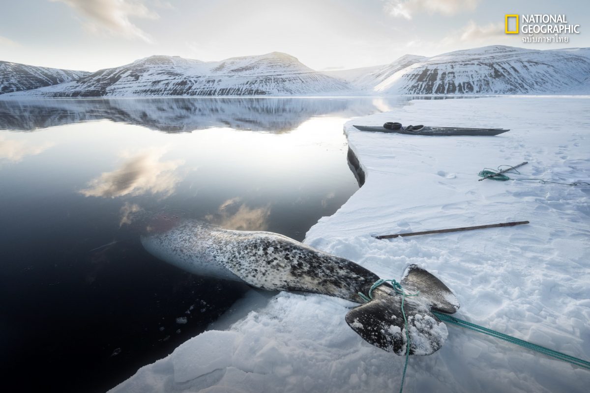 กิลลัก คริสเตียนเซน บังคับเรือคายักเข้าสู่น่านน้ำเปิดเพื่อล่าวาฬนาร์วาล เมื่อปีที่แล้ว พรานชาวอินูกุอิตวัย35 ปีผู้นี้กับเหล่าสหายพากันไปยังขอบน้ำแข็งที่จะปรากฏให้เห็นในฤดูใบไม้ผลิ โดยใช้เวลาครึ่งวันด้วยเลื่อนสุนัขจากกานากในกรีนแลนด์ เมืองที่อยู่ห่างจากอาร์กติกเซอร์เคิลไปทางเหนือราว 1,200 กิโลเมตรแห่งนี้เป็นเมืองที่อยู่เหนือ สุดของโลกเมืองหนึ่ง เสียงพ่นลมหายใจของวาฬนาร์วาลลอดออกมาจากน้ำที่ใสดุจกระจกใกล้สุดฝั่งตะวันตกของเกเกร์ตาร์ซวกหรือเกาะเฮอร์เบิร์ต นาร์วาลตัวนี้หยุดนิ่งที่ผิวน้ำ ราวกับเสนอตัวให้เขา ชาวอินูกุอิตบางคนอาจบอกอย่างนั้น