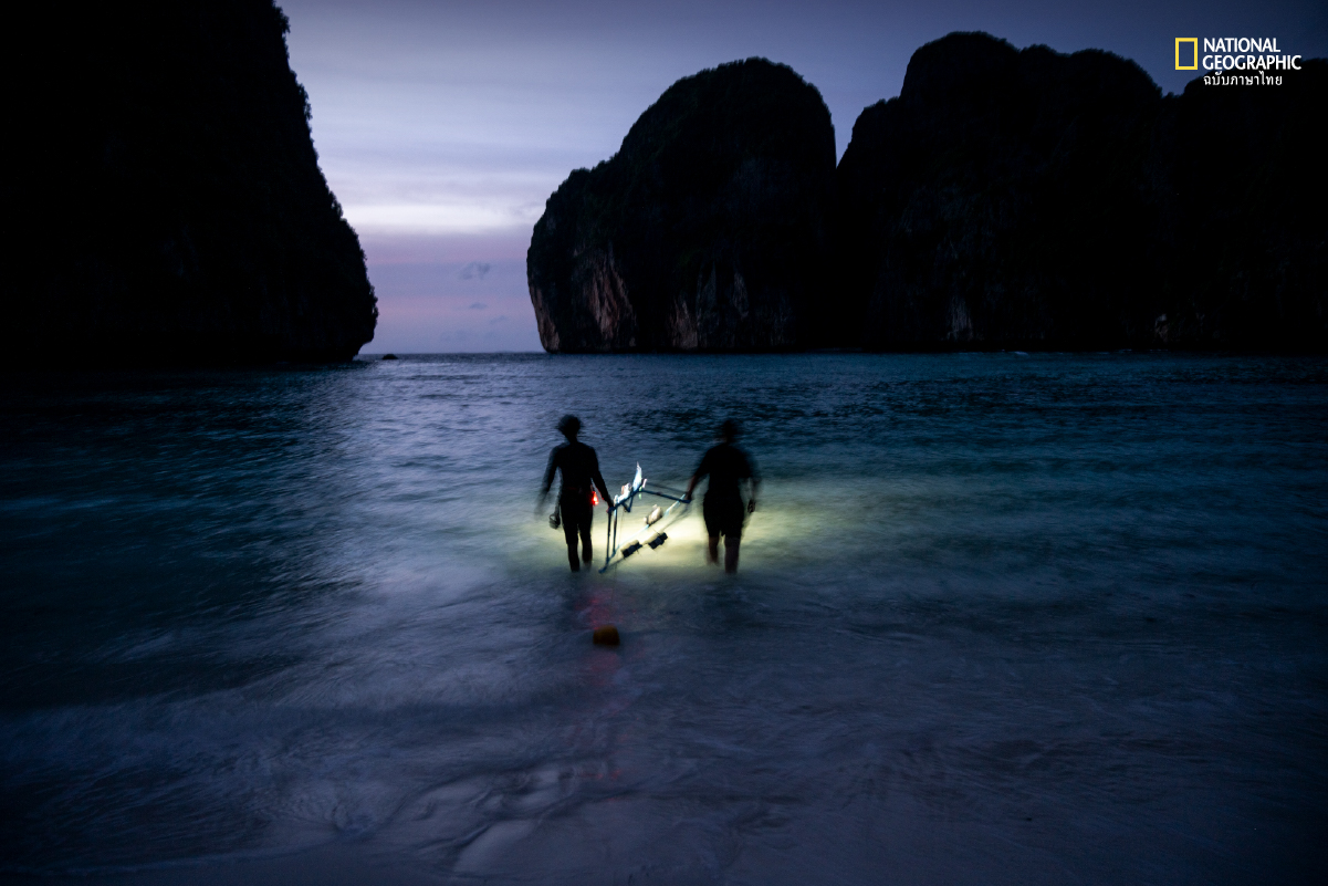 “พอได้ยินแบบนั้นพวกเราเลยรีบรวมทีมกัน ประกอบด้วยไอ้บ้า 3 คน คือ เม พี่ชิน และพี่วิช (วิชญุตร์ ลิมังกูร บุณยเนตร) พวกเราใช้ทุนและอุปกรณ์ส่วนตัว รีบขับรถลงกระบี่ พอไปถึงที่อ่าวมาหยา พวกเราก็ได้เข้าไปทำงานพร้อมกับเจ้าหน้าที่จากศูนย์ปฏิบัติการอุทยานแห่งชาติทางทะเลที่ 3 จังหวัดตรัง”