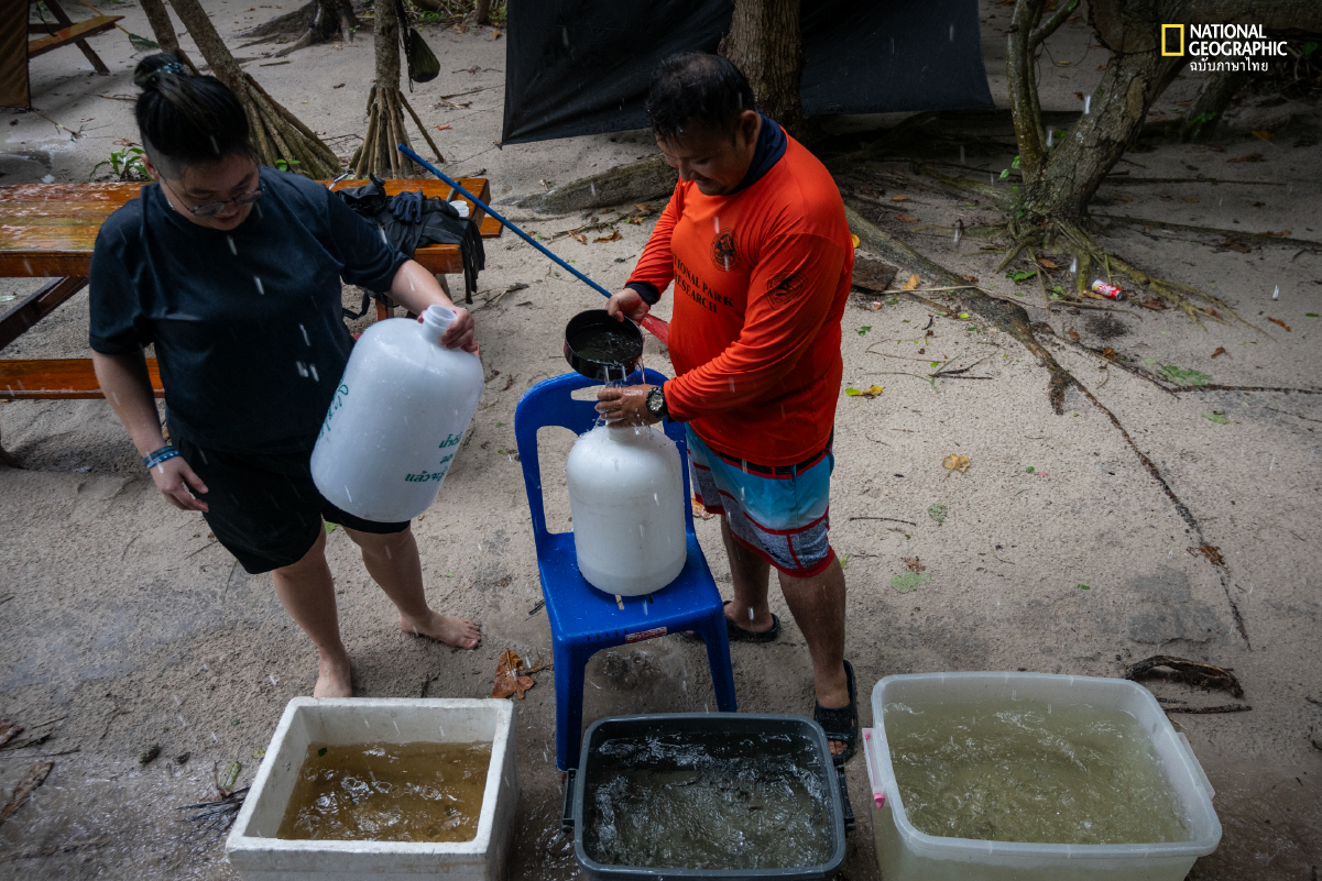 “พวกเราและเจ้าหน้าที่จากศูนย์ฯตรังทุกคน ทำงานกัน 6 วัน ด้วยความยากลำบาก เพราะไม่มีทั้งน้ำจืดและที่พัก มีเพียงเพิงร้านค้าสวัสดิการ(ที่ยังสร้างไม่เสร็จ) ที่ให้เราเอาอุปกรณ์วิจัยไปชาร์จแบต พอเก็บข้อมูลเสร็จ ยังไม่ทันได้พัก เราก็ต้องรีบสรุปข้อมูลให้ได้ภายใน 4 วัน เพื่อเสนอต่อคณะทำงานของกรมอุทยานฯ”
