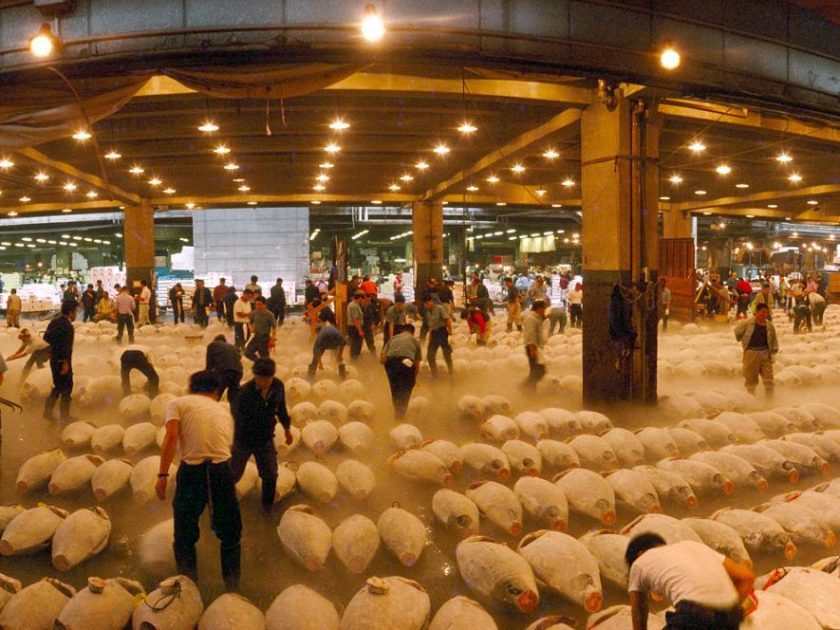 ยามเช้าตรู่อันหนาวเหน็บวันหนึ่งในเดือนมิถุนายน ผมยืนอยู่ในความมืดใกล้ฝั่งตะวันตกของแม่น้ำซูมิดะในกรุงโตเกียว มองดูนักท่องเที่ยวใส่เสื้อชูชีพไนลอนสีสด เป็นเสื้อแขนกุดแบบที่เราใส่เวลาเล่นฟุตบอลนัดกระชับมิตร ราวกับว่านักท่องเที่ยว 70 คนจากแอฟริกาใต้ จีน มาเลเซีย สเปน และรัสเซีย ที่ยืนตัวสั่นงันงกเดินทางมาที่นี่เพื่อวิ่งไล่ลูกบอลไปตามย่านริมฝั่งแม่น้ำแห่งนี้ ตอนนั้นเป็นช่วงเวลาหนึ่งหรือสองชั่วโมงก่อนฟ้าสาง และเรากำลังเตรียมตัวเที่ยวสึกิจิชิโจะ ตลาดปลาใหญ่ที่สุดในโลกในขณะนั้น สึกิจิเป็นเหมือนเขาวงกตของโกดังเก็บของ ตู้แช่แข็ง ท่าเทียบเรือ ลานประมูล และแผงขายปลา ซึ่งหล่อเลี้ยงนครหลวงแห่งนี้มาเกือบศตวรรษ ตอนผมไปเยือนเมื่อปีที่แล้ว ตลาดเก่าแก่แห่งนี้กำลังใกล้หมดอายุขัย แผงขายปลาที่ดูสับสนวุ่นวายและพื้นหินกรวดยังดึงดูดนักท่องเที่ยวผู้แสวงหาบรรยากาศแบบเดิมๆ ทว่าในมหานคร โตเกียว อันล้ำสมัย ตลาดเช่นนี้กลายเป็นส่วนหนึ่งของอดีตที่ไร้การจัดระเบียบและไม่ถูกหลักสุขาภิบาล พอถึงฤดูใบไม้ร่วง ตลาดสึกิจิจะปิดตัวลง และพ่อค้าแม่ขายต้องย้ายออกจากใจกลางเมืองไปยังตลาดแห่งใหม่ที่ดูจืดชืดทางตะวันออกเฉียงใต้แทน