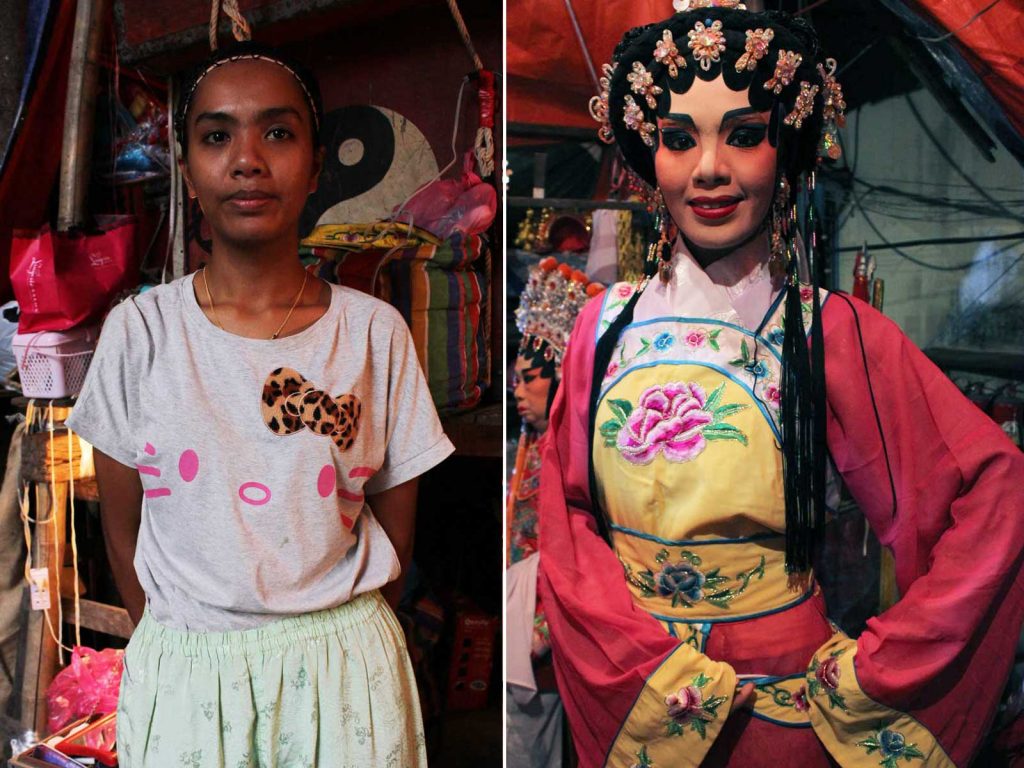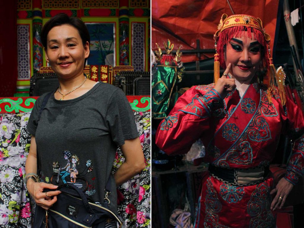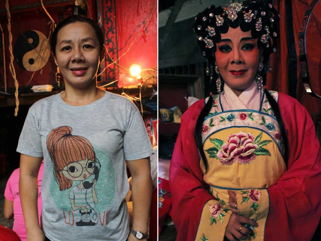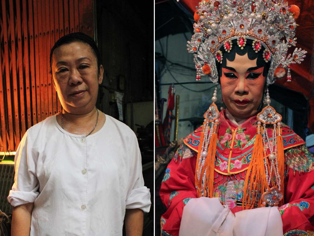 “เล่นงิ้วมาตั้งแต่อายุ 11 ค่ะ รวมตอนนี้ก็ประมาณสามสิบกว่าปีแล้ว เราไปดูงิ้วแล้วก็เห็นเพื่อนๆ รุ่นพี่เขาได้เล่นงิ้ว อยากเล่นบ้างก็เลยตามเพื่อนมาเล่น ตอนนั้นก็เลยเลิกไปโรงเรียนมาแสดงงิ้ว เรียกได้ว่าเล่นงิ้วมาทั้งชีวิตก็ได้ งิ้วมันเป็นอมตะนะคะ มีข้อคิดสอนคน เสื้อผ้าก็สวยแถมมีความเป็นศิลปะ แต่ยากนะกว่าจะมาถึงจุดนี้ ต้องฝึกพูดฝึกร้องฝึกจำบท อย่างพี่นี่ก็ฝึกหลายปีเลยกว่าจะได้มาเป็นตัวชูโรง เมื่อก่อนไม่มีไฟแอลอีดีแบบนี้นะ เขาใช้แสงเทียน คนดูก็น้อยลง แต่รูปแบบการเล่นเราเองก็ต้องพัฒนาเปลี่ยนไปตามยุคสมัย ต้องไม่หยุดนิ่ง พัฒนาให้ดีกว่าเดิม จริงๆ ทุกวันนี้ก็มีเด็กรุ่นใหม่สนใจมาดูงิ้วกันเยอะนะ”