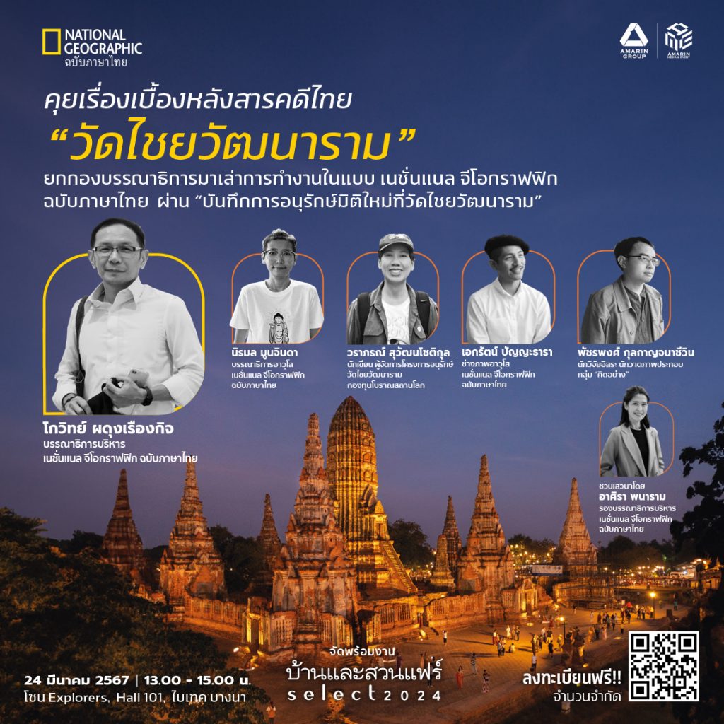 ในงานบ้านและสวน select ช่วงเดือนมีนาคม 2567 ที่ผ่านมา นอกจากเนชั่นแนล จีโอกราฟฟิก ฉบับภาษาไทย มีนิทรรศการ “The Journey of National Geographic Thailand” แล้ว เรายังได้จัดเสวนาเล่าเรื่องการทำสารคดี “การอนุรักษ์มิติใหม่ที่วัดไชยวัฒนาราม” สารคดีขึ้นปกฉบับเดือนกุมภาพันธ์ 2567 เพื่อเชื่อมโยงกับนิทรรศการ อีกทั้งนี่เป็นสารคดีที่มีองค์ประกอบหลากหลาย มีเนื้อหาชวนให้มอง “วัดไชยวัฒนาราม” ในมุมการอนุรักษ์ที่มีมากกว่าการรักษาโบราณสถานให้คงอยู่