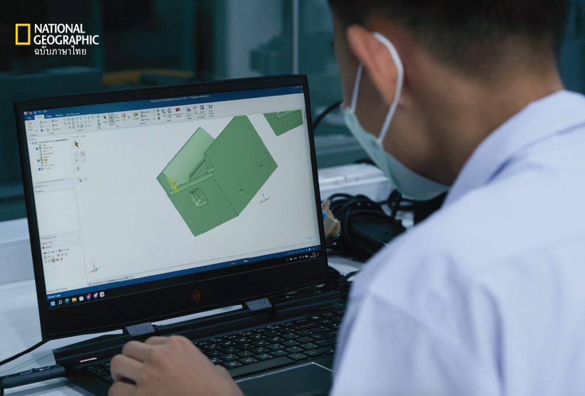 โปรแกรมออกแบบทรีดีแคด (3D CAD) ที่กำลังปรากฏอยู่บนหน้าจอคอมพิวเตอร์นี้ แสดงรายละเอียดแม่แบบ ขาตั้งลำโพง นิ้วคลิกหมุนมุมอย่างชำนาญ ปรับเปลี่ยนรายละเอียดเล็กน้อยที่แทบไม่มีใครสังเกต