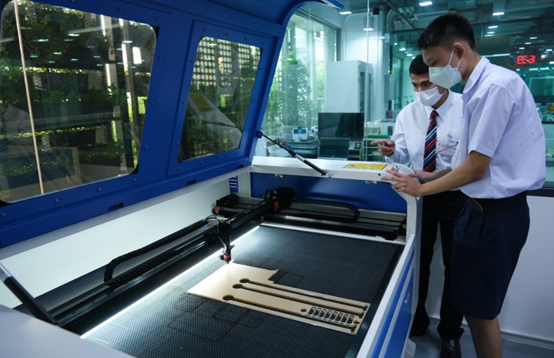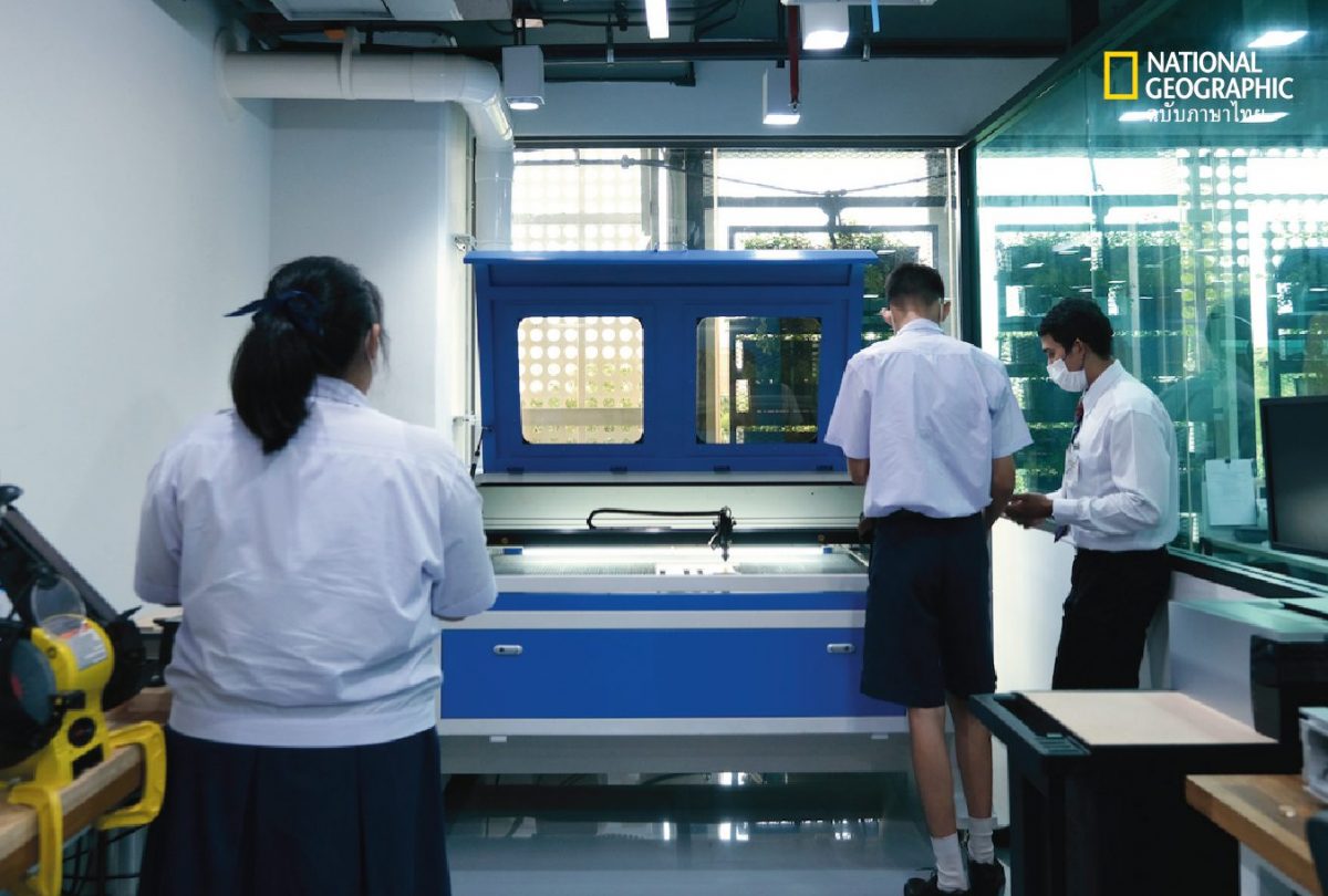 ก่อนจะลาจากห้องปฏิบัติการนวัตกรรม บรรยากาศอบอวลด้วยความอย่างรู้อยากลองของทุกคนที่ยืนหน้าเครื่องตัดอะคริลิกด้วยเลเซอร์ที่กำลังทำงานอย่างขะมักเขม้น เมื่ออาจารย์เกรียงอธิบายหลักการทำงานเสร็จก็ถอยหลังออกมา ปล่อยให้อาจารย์ผู้ช่วยเข้ามาดูแลการตัดชิ้นส่วนที่จิรวัฒน์ออกแบบ ในยามเย็นนี้แสงของเครื่องที่กำลังทำงานสะท้อนใบหน้าคณาจารย์และนักเรียนของสถาบันจิตรลดาให้โชติช่วงขึ้นมา