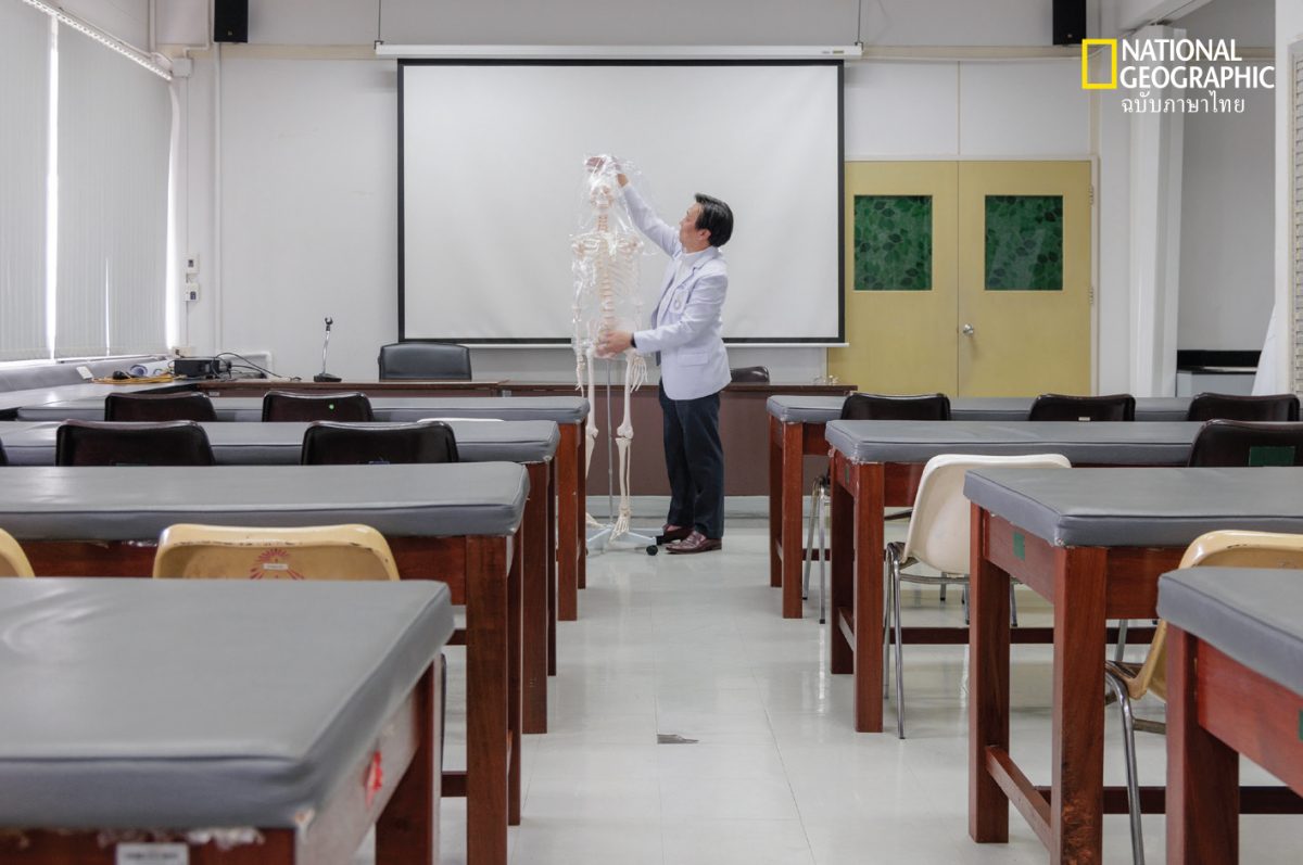 เรานัด ดร.วรชาติ เฉิดชมจันทร์ คณบดีคณะกายภาพบำบัดและเวชศาสตร์การกีฬา มหาวิทยาลัยรังสิต ในห้องทำงานชั้นเดียวกัน แต่ก่อนจะเลี้ยวขวาไปติดต่อเจ้าหน้าที่ เราเดินไปตามความสงสัย ก่อนจะพบว่าวัตถุบนโต๊ะที่เรียงรายตรงหน้าคือร่างไร้ชีวิต และข้อความบนกระดานที่เคยมองยาก ขณะนี้มันชัดเจนแล้วว่าคือ “พิธีทำบุญอาจารย์ใหญ่ประจำปี ” ของคณะกายภาพฯ