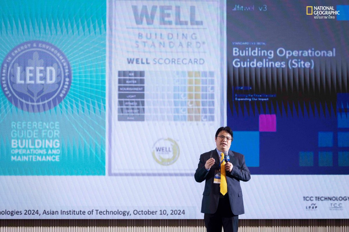 เขายกตัวอย่างของการสร้างสภาพแวดล้อมในอาคาร มีมาตรฐานระดับโลกที่เราอาจคุ้นเคยกันอยู่ เช่น เครื่องหมาย LEED สำหรับรับรองอาคารสำนักงานที่ออกแบบอย่างยั่งยืน, เครื่องหมาย WELL สำหรับรับรองอาคารที่อยู่อาศัยที่ออกแบบเพื่อความมีสุขภาวะที่ดีและยั่งยืน รวมถึง Sustainable Development Report สำหรับธุรกิจต่างๆ ที่ต้องทำ และ Building Operational guidelines (Site) มาตรฐานการก่อสร้างที่ยั่งยืนซึ่งสอดคล้องกับเป้าหมายด้านความยั่งยืนของ UN ที่อาคารต่าง ๆ พึงมี