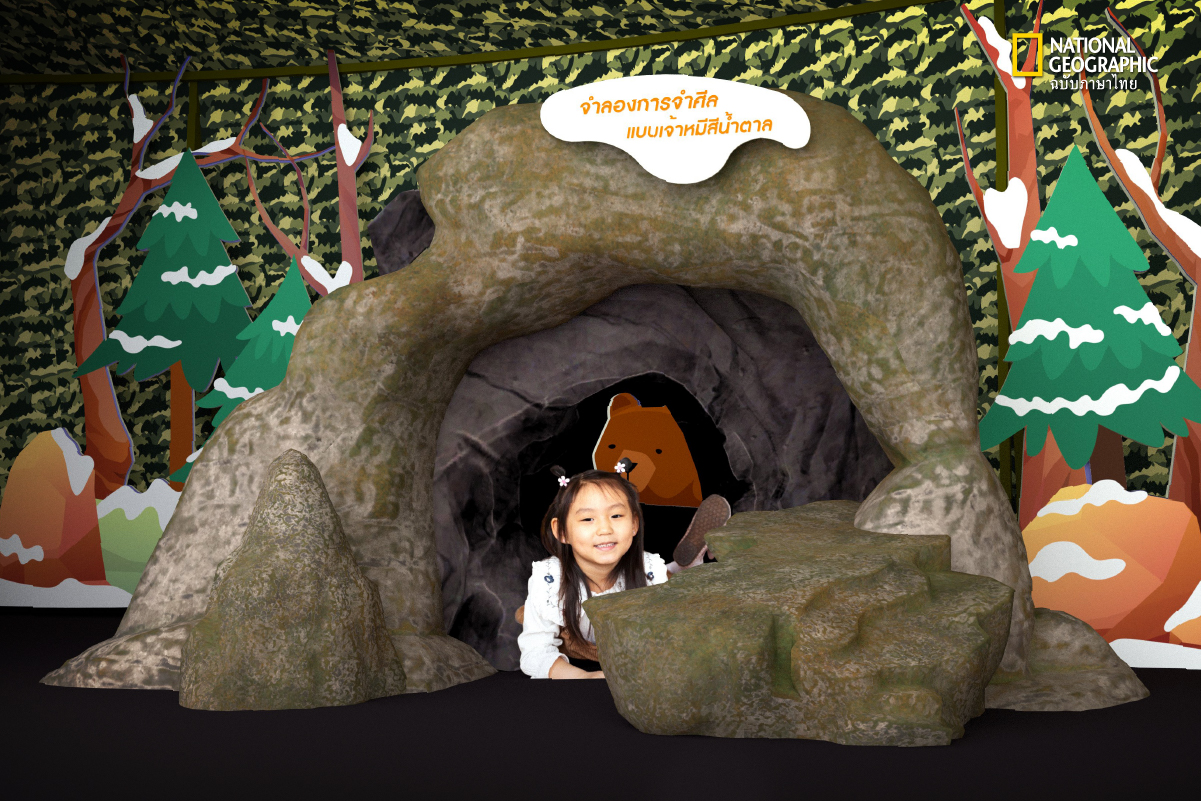 - เข้าไปนั่งในถ้ำจำลองแบบที่หมีสีน้ำตาลใช้จำศีล