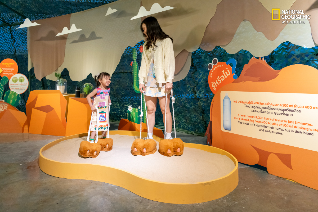 สิ่งที่ทำให้นิทรรศการนี้พิเศษคือ เด็ก ๆ จะไม่ได้แค่ฟังหรือดู แต่จะได้ลองด้วยตนเอง ผ่านกิจกรรมที่ออกแบบโดยใช้แนวคิด Sensory Play หรือการเรียนรู้ผ่านประสาทสัมผัส เช่น การสวมรองเท้าทรงเท้าอูฐเพื่อเข้าใจการเดินบนทราย การเข้าไปในถ้ำแบบที่หมีสีน้ำตาลใช้จำศีล การใส่ถุงมือพังผืดเลียนแบบตุ่นปากเป็ด หรือการยืนเบียดกันเป็นกลุ่มเพื่อเรียนรู้ว่าการอยู่รวมกันของเพนกวินช่วยให้พวกมันรอดพ้นจากอุณหภูมิต่ำกว่า -40 องศาได้อย่างไร