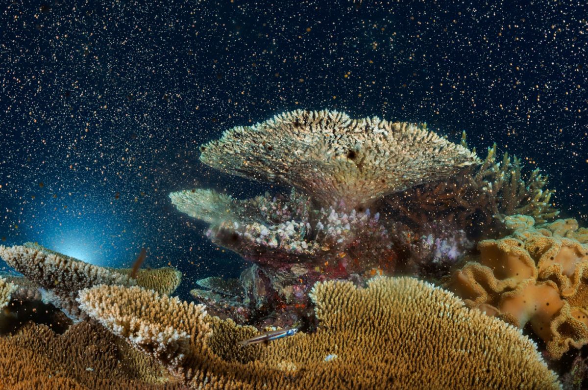 นักชีววิทยาทางทะเล ฮานนา โคช และเพื่อนร่วมทีมของเธอจากศูนย์วิจัยทางทะเลและจัดแสดงพันธุ์สัตว์น้ำทางทะเล พวกเขาจับตามองและเฝ้ารอ จนกระทั่งเวลาก่อนเที่ยงคืน ได้เกิดการปะทุอย่างเงียบสงัดของปะการังตลอดแนวพืดหินทั้งหมด เป็นกลุ่มก้อนสีส้มอมชมพูขนาดเล็กของสเปิร์มและไข่ แต่งแต้มทะเลด้วยจุดสีแห่งการปะทุขึ้นของชีวิต
