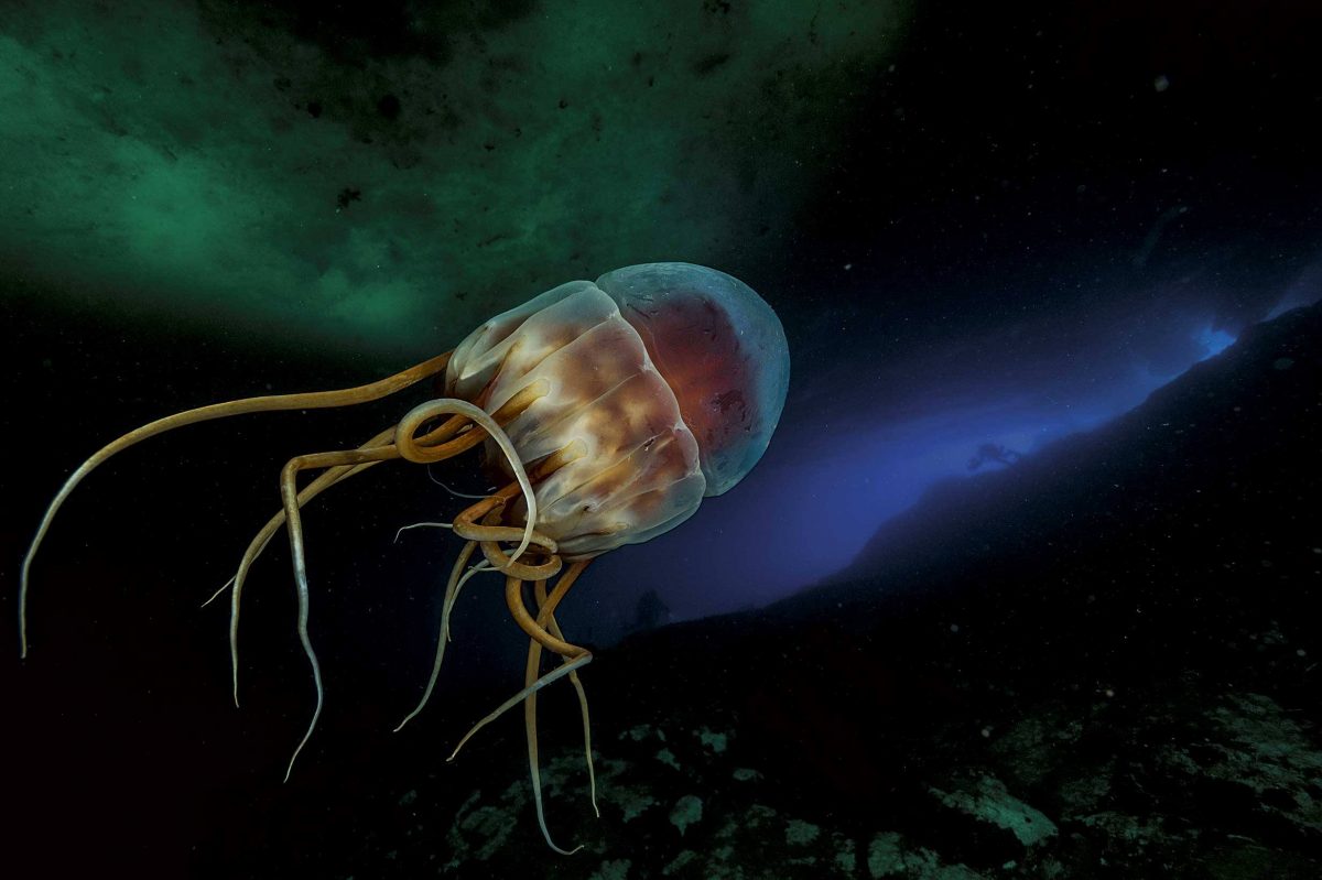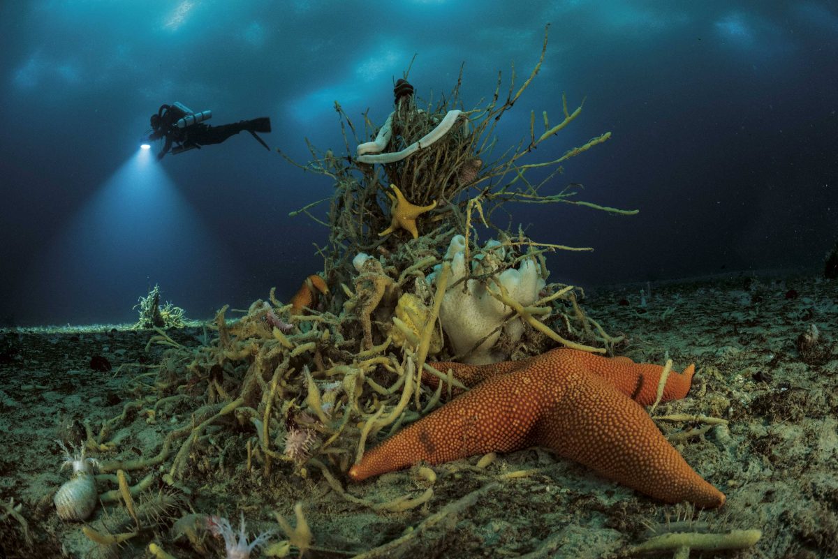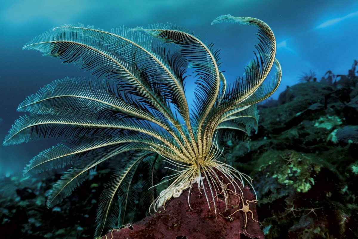 ความหลากหลายนั้นมากมายละลานตาที่สุดที่ระดับความลึก 70 เมตร ซึ่งเป็นขีดจำกัดของการดำนํ้าของเรา เราเห็นกัลปังหาพุ่ม สัตว์จำพวกมีกระดอง ปะการังอ่อน ฟองนํ้า ปลาเล็กปลาน้อย สัตว์ไม่มีกระดูกสันหลังที่เกาะยึดตัวอยู่กับที่มีขนาดใหญ่โตเป็นพิเศษ สัตว์คล้ายพืชซึ่งปรับตัวได้เป็นอย่างดีในสภาพแวดล้อมค่อนข้างคงที่เหล่านี้เติบโตอย่างเชื่องช้า แต่ดูเหมือนจะโตได้อย่างไร้ขีดจำกัดถ้าไม่มีอะไรมารบกวน เราอดสงสัยไม่ได้ว่า สิ่งมีชีวิตเหล่านี้จะตอบสนองอย่างไรเมื่อการเปลี่ยนแปลงสภาพภูมิอากาศทำให้โลกของพวกมันร้อนขึ้น