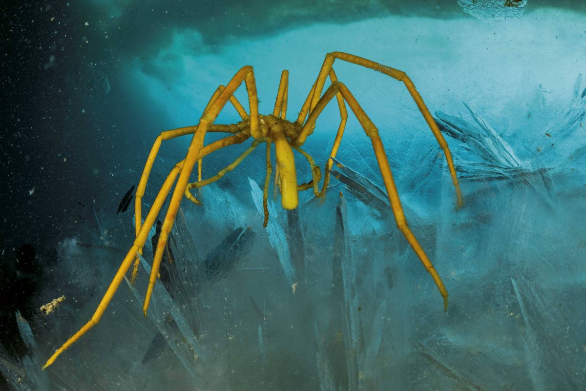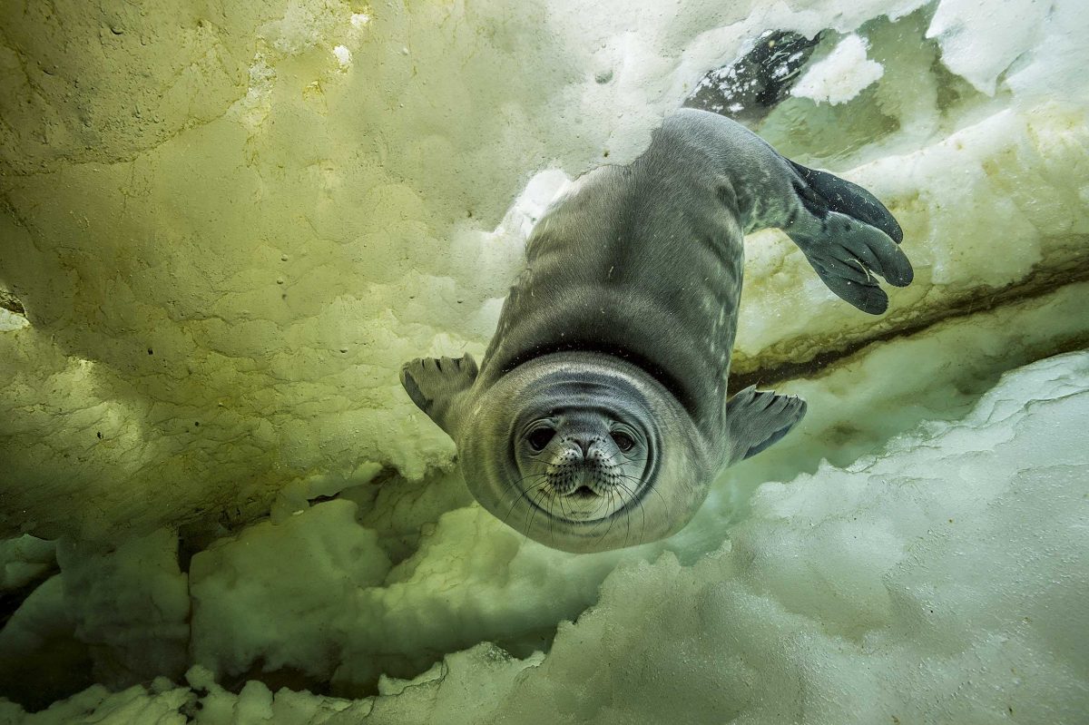 ระหว่างกลับขึ้นสู่ผิวนํ้า ความหลากหลายทางชีวภาพก็เริ่มลดลง น่านนํ้าระดับตื้นกว่ามีสภาพแวดล้อมที่เสถียรหรือคงที่น้อยกว่า ภูเขานํ้าแข็งและนํ้าแข็งทะเลที่ล่องลอยอยู่มักครูดไปกับก้นสมุทร อีกทั้งการแข็งตัวและการละลายของพื้นผิวทะเลตามฤดูกาล ซึ่งดึงนํ้าจืดออกไปจากมหาสมุทรแล้วปล่อยคืนกลับลงมาใหม่ ทำให้ค่าความเค็มของนํ้าแกว่งไปมาอย่างสุดขั้ว แต่ก็ยังมีอะไรมากมายให้ดูเพลินตา สาหร่ายขนาดเล็ก (microalgae) เกาะตามเพดานนํ้าแข็งเปลี่ยนให้เป็นเพดานรุ้งสีส้ม เหลือง และเขียว อันที่จริงเพดานที่ว่านี้ดูเหมือนเขาวงกตสลับซับซ้อนมากกว่า เพราะประกอบด้วยชั้นนํ้าแข็งสูงๆ ต่ำๆ