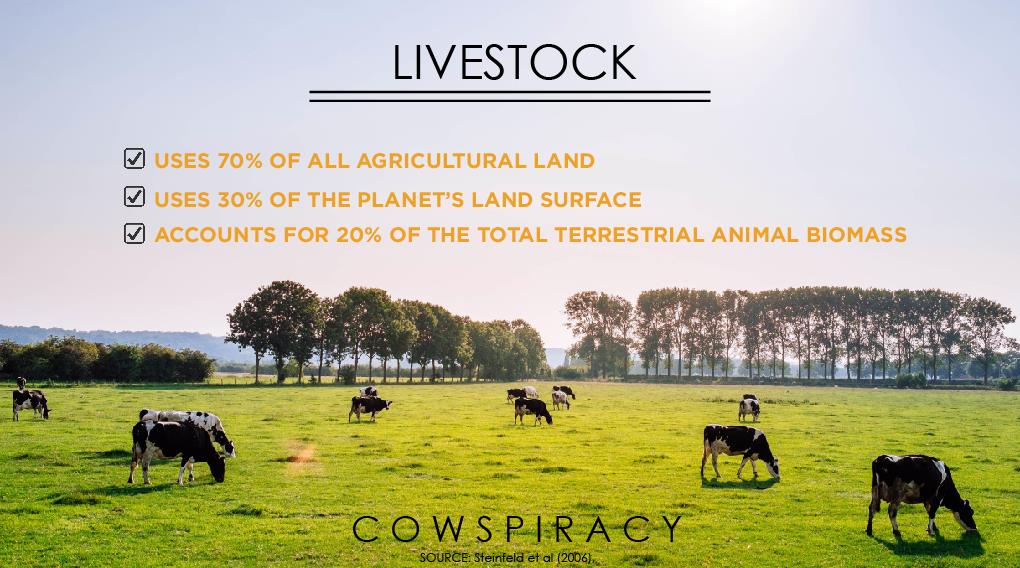 Cowspiracy ภาพยนตร์สารคดีที่เสนอข้อเท็จจริงเกี่ยวกับอุตสาหกรรมปศุสัตว์ ที่เกี่ยวโยงกับการทำลายทรัพยากรธรรมชาติ การปล่อยก๊าซเรือนกระจก และธุรกิจผลิตอาหารป้อนคนทั้งโลก