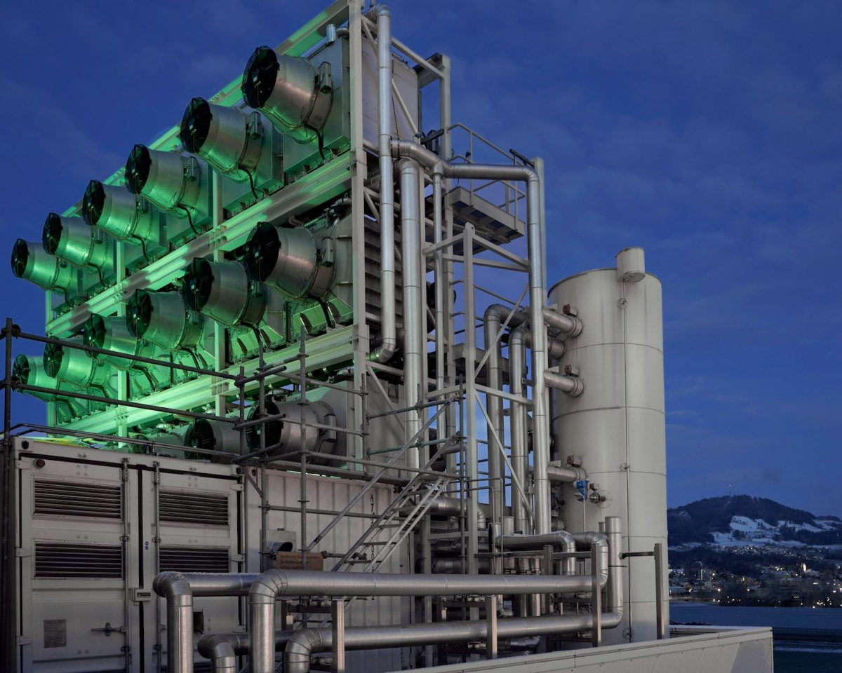 ในซูริก สวิตเซอร์แลนด์ เครื่องจักรที่ผลิตโดยบริษัท Climeworks กำลังทำการดักจับคาร์บอนไดออกไซด์จากอากาศ ซึ่งเป็นควาพยายามที่จะบรรเทาสภาวะการเปลี่ยนแปลงของอากาศ ขั้นแรก อากาศจะถูกดูดเข้าไปยังตัวสะสมด้วยพัดลมผ่านตัวกรองสำหรับดักจับคาร์บอนไดออกไซด์ จากนั้น ก๊าซจะถูกให้ความร้อนสูง แล้วจึงค่อยรวบรวมและนำกลับมาใช้ใหม่หรือกักเก็บเอาไว้