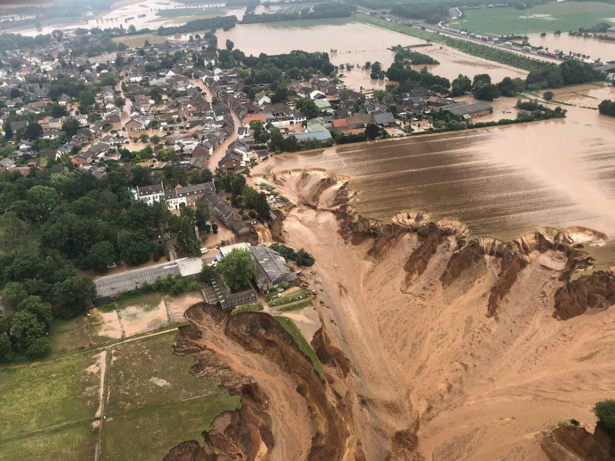 อุทกภัยรุนแรงที่เกิดขึ้นจากน้ำฝนมากที่สุดเป็นประวัติการณ์ในเยอรมนีช่วงเดือนกรกฎาคม ภาพนี้ถูกแชร์บนทวิตเตอร์โดยเจ้าหน้าที่ในโคโลญ แสดงให้เห็นภาพน้ำท่วมใน Erftstadt-Blessem น้ำฝนที่ตกภายในวันเดียวทั่วทั้งภูมิภาคมีปริมาณเทียบเท่ากับน้ำฝนที่ตกในเวลาเกือบ 2 เดือน บ้านเรือนหลายหลังถูกกวาดล้าง และผู้คน 170 คนเสียชีวิต