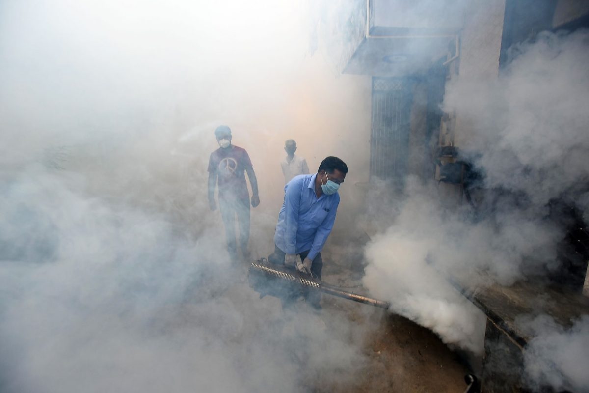 คนงานพ่นควันกำจัดยุงบนถนนในกรุงนิวเดลี อินเดีย เพื่อป้องกันการแพร่ระบาดของโรคต่างๆ เช่น ไข้เลือดออก มาลาเรีย และชิคุนกุนยา เมื่ออุณหภูมิอากาศสูงขึ้น ความเสี่ยงที่ผู้คนจะติดโรคที่มียุงเป็นพาหะจะเพิ่มขึ้น บทบรรณาธิการซึ่งตีพิมพ์โดยนักวิทยาศาสตร์ชื่อดังในวารสารการแพทย์หลายร้อยฉบับเรียกร้องให้มีการดำเนินการด้านสภาพอากาศอย่างรวดเร็ว เพื่อปกป้องสุขภาพมนุษย์