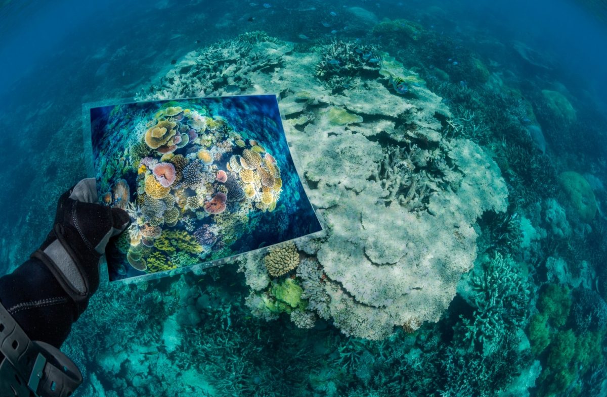 ภาพถ่ายนี้ในปี 2010 มาจากแนวปะการัง Great Barrier Reef ในออสเตรเลียถูกวางเคียงข้างกับแนวปะการังจุดเดียวกันในปี 2019 ซึ่งอุณหภูมิของมหาสมุทรที่เพิ่มขึ้นในปี 2016 น่าจะเป็นสาเหตุของเหตุการณ์นี้
