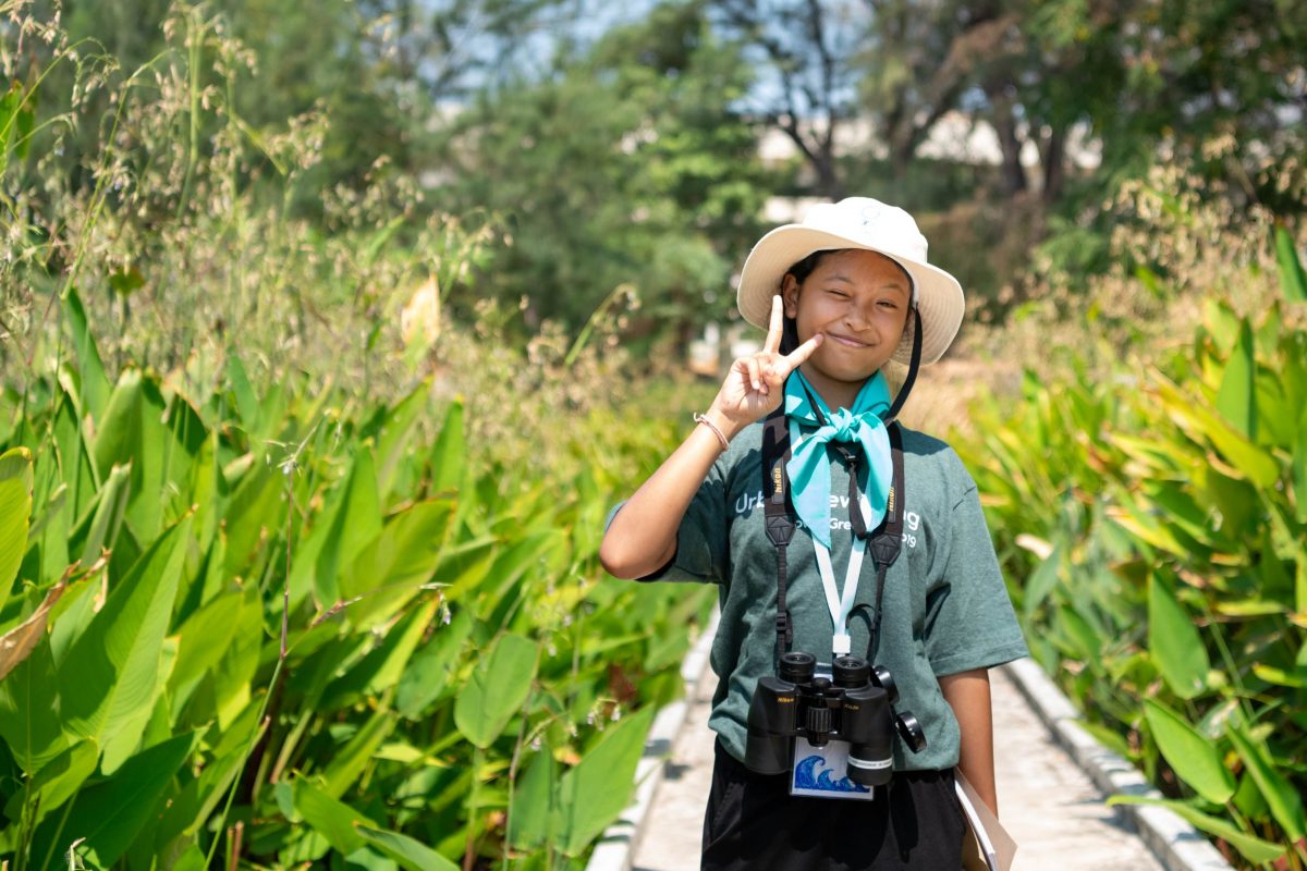 ระหว่างที่เดินแวะทักทายสิ่งมีชีวิตหลากหลายชนิดรอบ ๆ สวนกันอยู่ น้องเยาวชนที่เดินมาด้วยกันชี้มือเรียกให้หยุดดูว่าเขาได้เจอนกตัวหนึ่งยืนเกาะบนต้นไม้สูง น้องคนหนึ่งพยายามส่องนกผ่านกล้อง และอธิบายลักษณะของนกให้เพื่อน ๆ ฟัง เพื่อช่วยกันหาคำตอบว่านกที่เจอเป็นนกสายพันธุ์อะไร น่าทึ่งที่พวกเขาสามารถจดจำชนิดพันธุ์ของนกได้มากมาย ซึ่งทำให้การเดินสำรวจเพลิดเพลินขึ้น ไม่ว่าจะพบเห็นอะไร ก็นำมาเป็นโจทย์ให้เพื่อน ๆ ได้ร่วมทายกันตลอดเส้นทาง