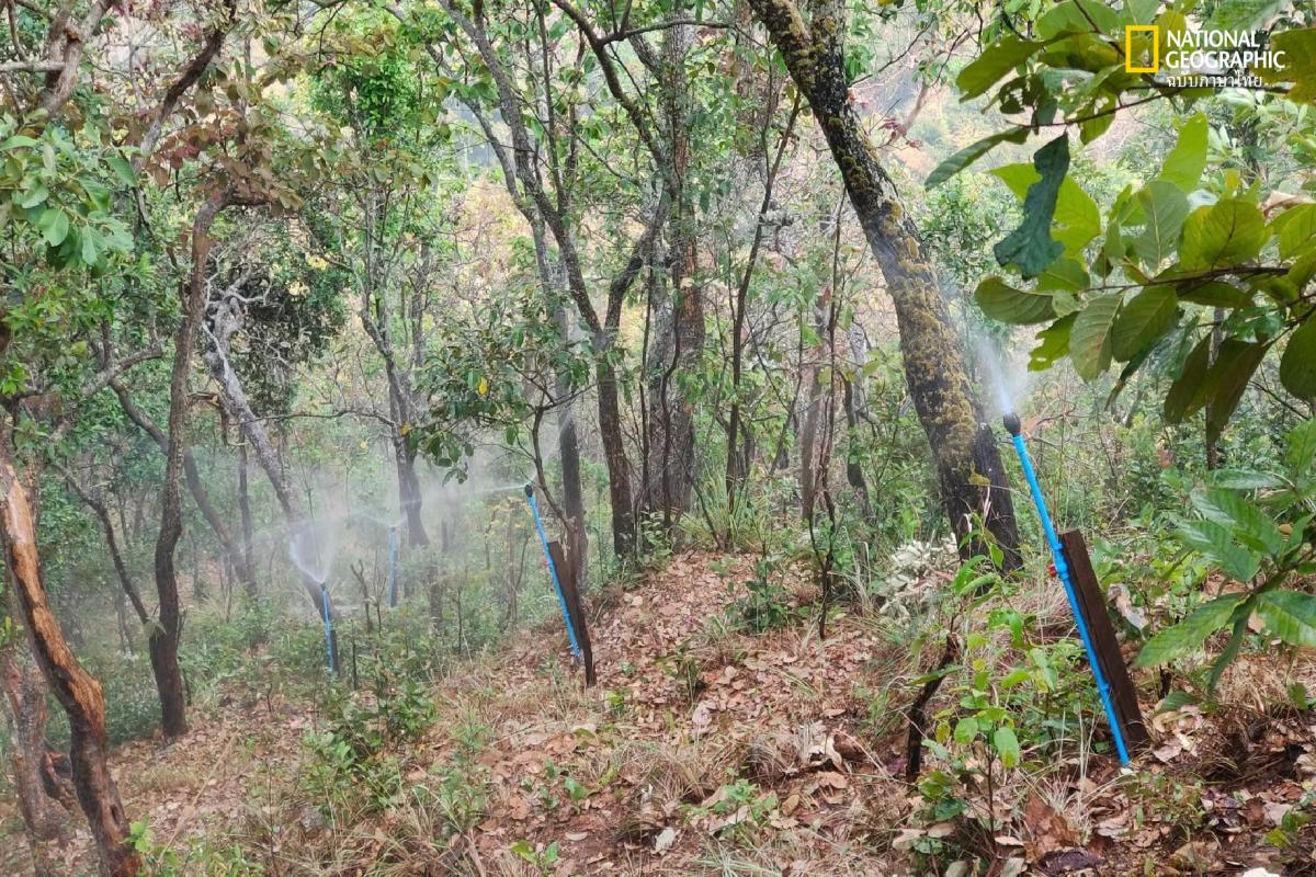 แนวกันไฟระบบสปริงเกอร์รอบป่าต้นน้ำ คือหัวใจของการเติมความชุ่มชื้นให้ดิน ระบบจะทำงานอัตโนมัติทุก ๆ หนึ่งชั่วโมง ครั้งละ 15 นาที เพื่อรักษาความชื้นในผืนป่าให้คงอยู่เสมอ