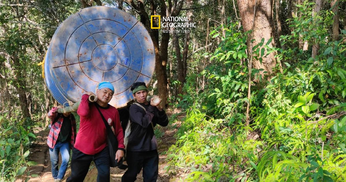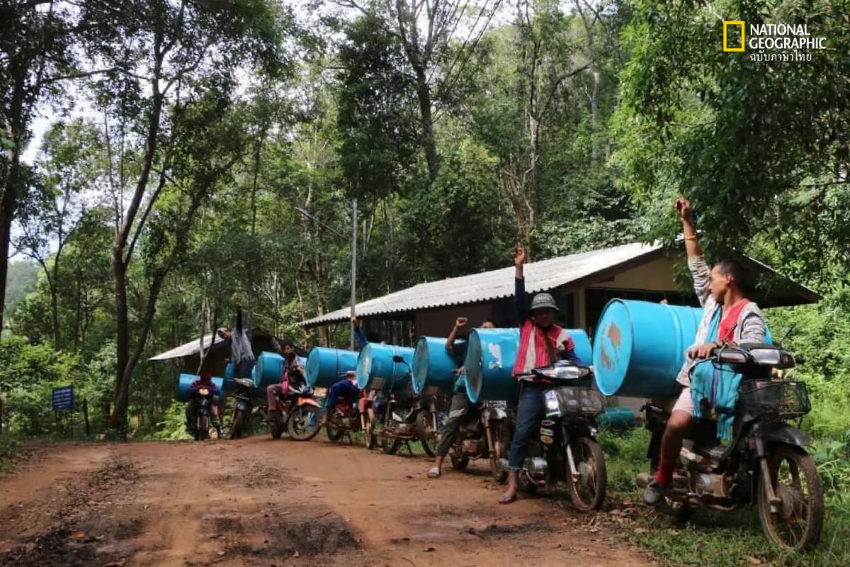 ชาวบ้านร่วมแรงกันแบกถังน้ำขนาด 200 ลิตร เข้าป่า เพื่อนำถังน้ำไปสำรองน้ำไว้สำหรับอุปโภคและเป็นแหล่งน้ำสำคัญในการดับไฟป่าในจุดที่เข้าถึงยาก