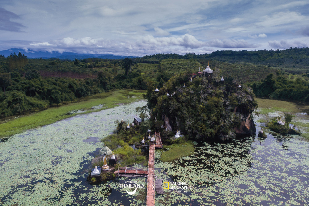 นอกจากนี้อีกหนึ่งสถานที่เที่ยวแบบ Unseen ของหมู่บ้านที่เราแนะนำว่าไปแล้วไม่ควรพลาดไปชมโดยเฉพาะชายหนุ่มคือ ‘เจดีย์พระธาตุโบอ่อง’ เจดีย์ทรงมอญที่ตั้งอยู่กลางเกาะหินปูนซึ่งล้อมรอบด้วยบึงบัวขนาดใหญ่ ส่วนหนึ่งของวัดพระธาตุโบอ่องอันเก่าแก่ และเป็นวัดแห่งเดียวของหมู่บ้านที่มีตำนานเล่าขานกันว่า ครั้งหนึ่งเคยมีสตรีเดินข้ามสะพานไปสู่เจดีย์บนยอดเขาจนทำให้น้ำในบึงแห้งเหือด และกลายเป็นที่มาของความเชื่อและข้อห้ามไม่ให้ผู้หญิงเดินข้ามสะพานอย่างเด็ดขาดในเวลาต่อมาจนถึงปัจจุบัน