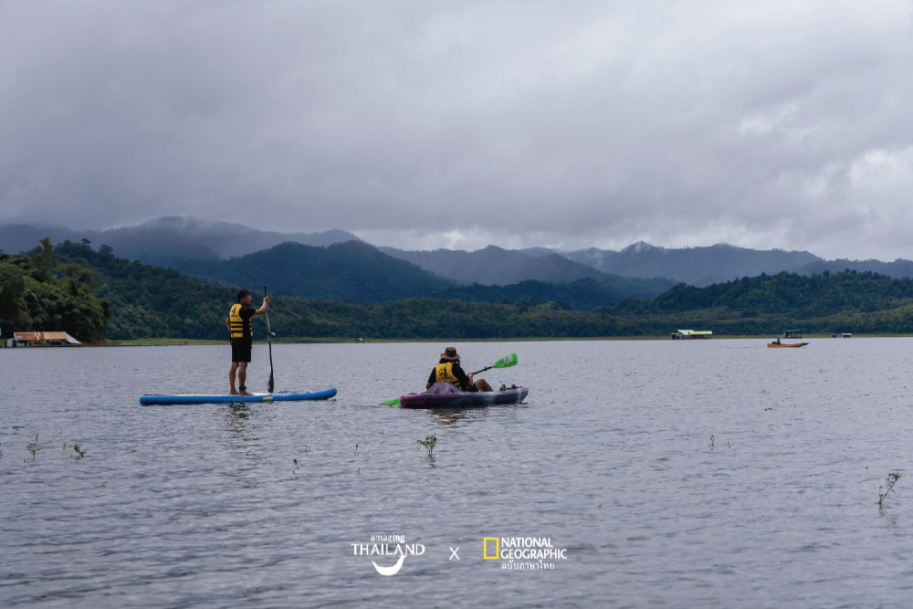 แพที่เรานอน มีแพลากที่สามารถแยกส่วนออกจากตัวบ้านได้ ตกเย็นเรือลำเดียวกันกับที่รับเรามาจากตลิ่งก็จะลากแพของเราไปยังจุดที่สามารถมองพระอาทิตย์ตกที่สวยที่สุด หรือไปในจุดใดตามใจเราก็ได้ (แบบไม่ไกลเกินไปนะ) ได้อยู่กลางเขื่อนทั้งที จะไม่ลงน้ำเลยก็ใช่เรื่อง พวกเราจึงใช้เวลาช่วงเย็นที่ฟ้าเป็นใจพายเรือคายัคและ SUP อย่างหนำใจจนฟ้ามืด
