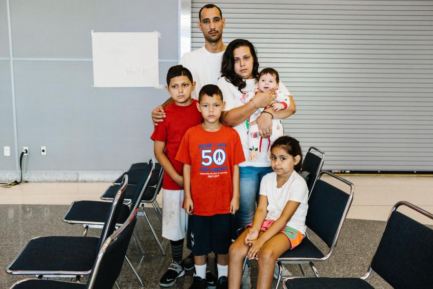 สเตฟีน โลเปซ (คนที่สองจากขวา) และครอบครัว “ระดับน้ำสูงขึ้นเรื่อยๆ และเรามีเด็กๆ เราจึงพยายามอพยพขึ้นไปบนที่สูงขึ้น… ฉันจะไม่มีวันลืมภาพสามีกำลังเดินลุยน้ำดำมืดไปกับลูกๆ พลางคิดว่าเราคงจะไม่รอด”