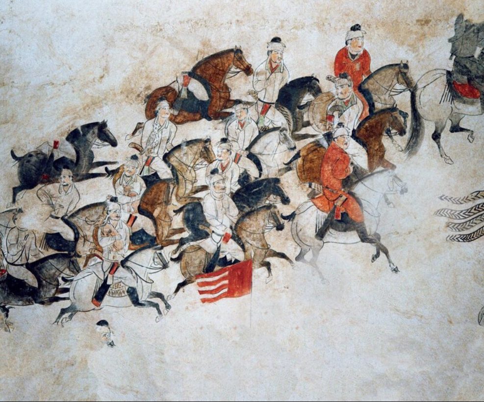 ภาพการล่าสัตว์บนภาพจิตรกรรมฝาผนังศตวรรษที่เจ็ดถึงแปด จากสุสาน Qianling ใกล้เมืองซีอาน ภาพถ่ายโดย SUPERSTOCK/AGE FOTOSTOCK