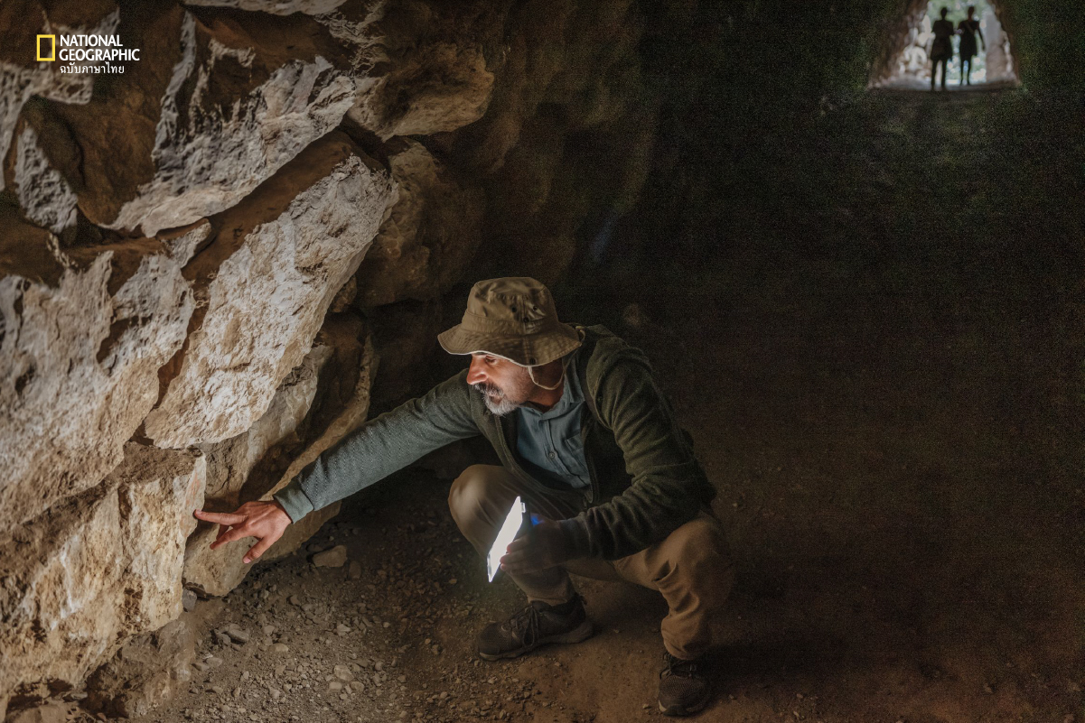 เราหยุดเมื่อไปถึงครึ่งทางเดิน ขณะก้มลงต่ำ เกนช์ชี้ให้ผมดูภาพวาดสีออกชมพูขนาดเท่าฝ่ามือบนกำแพงหิน ซึ่งเป็นหนึ่งในสัญลักษณ์ 249 รูปที่เขาค้นพบในอุโมงค์นี้เมื่อปี 2022