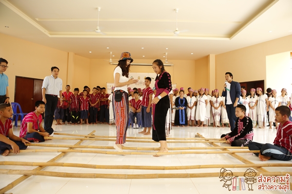 เริ่มต้นกิจกรรมด้วยการแสดงโชว์ร้องเพลงและเล่นเครื่องดนตรีท้องถิ่นประกอบการละเล่นกระทบไม้ไผ่จากน้องๆ นักเรียน นอกจากจะเป็นภาพที่หาดูได้ยากแล้ว ยังสร้างความสนุกสนานและเพลิดเพลินเป็นอย่างยิ่ง สาวแพนเค้กไม่รอช้าขอร่วมแจมความสนุกด้วย โดยมีน้องๆ นักเรียนเป็นคนสอนจังหวะก้าวขาที่ถูกต้อง แม้ตอนแรกนางเอกสาวจะดูกลัวๆ แต่ในที่สุดก็จับจังหวะได้และสนุกไปกับการละเล่นนี้ จัดเป็นช่วงที่เรียกรอยยิ้มจากผู้ชมไปได้ไม่น้อย