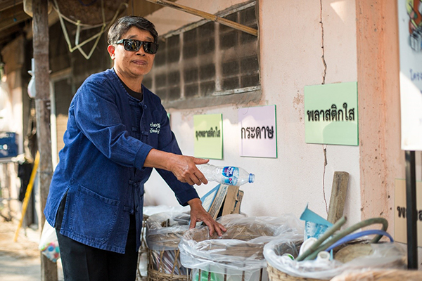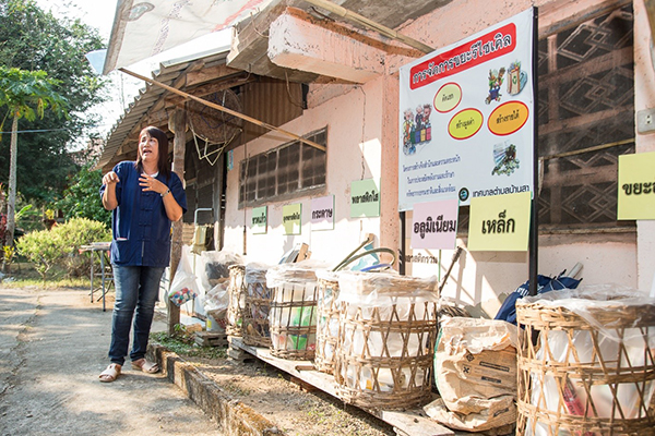 การจัดการขยะรีไซเคิล ชาวบ้านจะแยกวัสดุเป็นหมวดต่างๆ เช่น กระดาษ สังกะสี พลาสติก และขวดแก้ว เป็นต้น แล้วนำไปขายให้กับธนาคารขยะชุมชนหรือนำกลับมาหมุนเวียนใช้ซ้ำ เป็นการเสริมสร้างนิสัยการแยกขยะ และช่วยสร้างรายได้จากขยะอีกด้วย