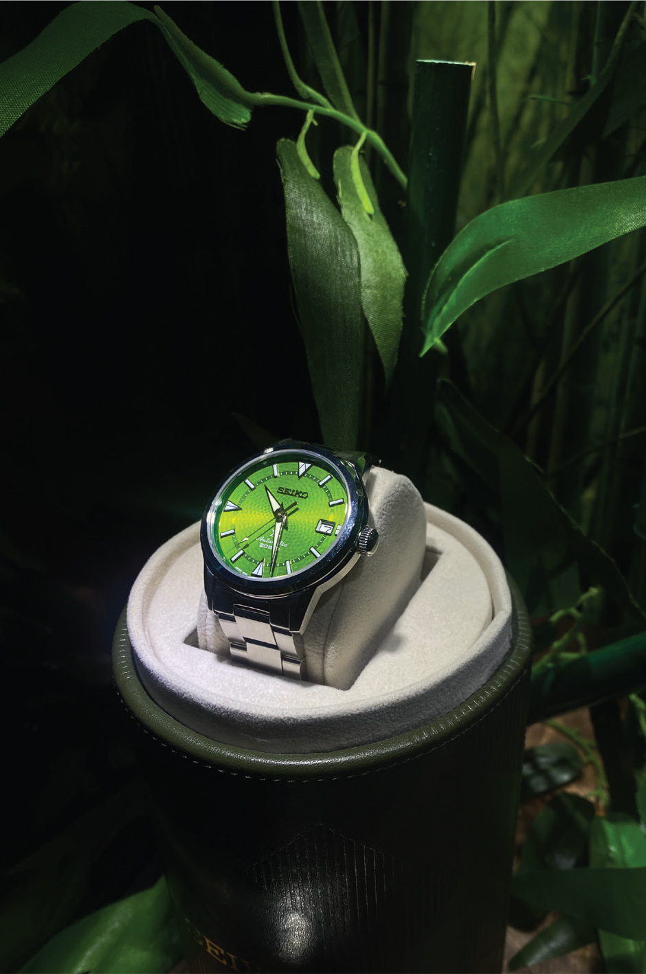 ความโดดเด่นของรุ่น “Seiko Prospex Bamboo Grove Limited Edition” นี้คือหน้าปัดสีเขียวแบมบูซึ่งถูกถ่ายทอด มาจากเฉดสีของยอดอ่อนใบไผ่ที่พริ้วไหวตามสายลมในป่า พื้นหน้าปัดถูกรังสรรค์ด้วยเทคนิคพิเศษ ถอดแบบจากลวดลายคล้ายหัตถกรรมที่เกิดจากการสานไม้ไผ่ ทำให้หน้าปัดดูมีมิติมากขึ้นเมื่อเล่นกับแสง ชุดเข็มทั้ง 3 ถูกออกแบบให้เป็นสีทอง ตัดกับพื้นสีเขียวของใบไผ่ อินเด็กซ์ที่ตำแหน่ง 12, 9 และ 6 นาฬิกา ยังคงดีไซน์ให้คงเอกลักษณ์ของคอลเลกชัน Alpinist ไว้ พร้อมฟังก์ชันหน้าต่างบอกวันที่ที่ 3 นาฬิกา แมตช์คู่กับสายสเตนเลสสตีล มอบลุคแกร่งอย่างลงตัว