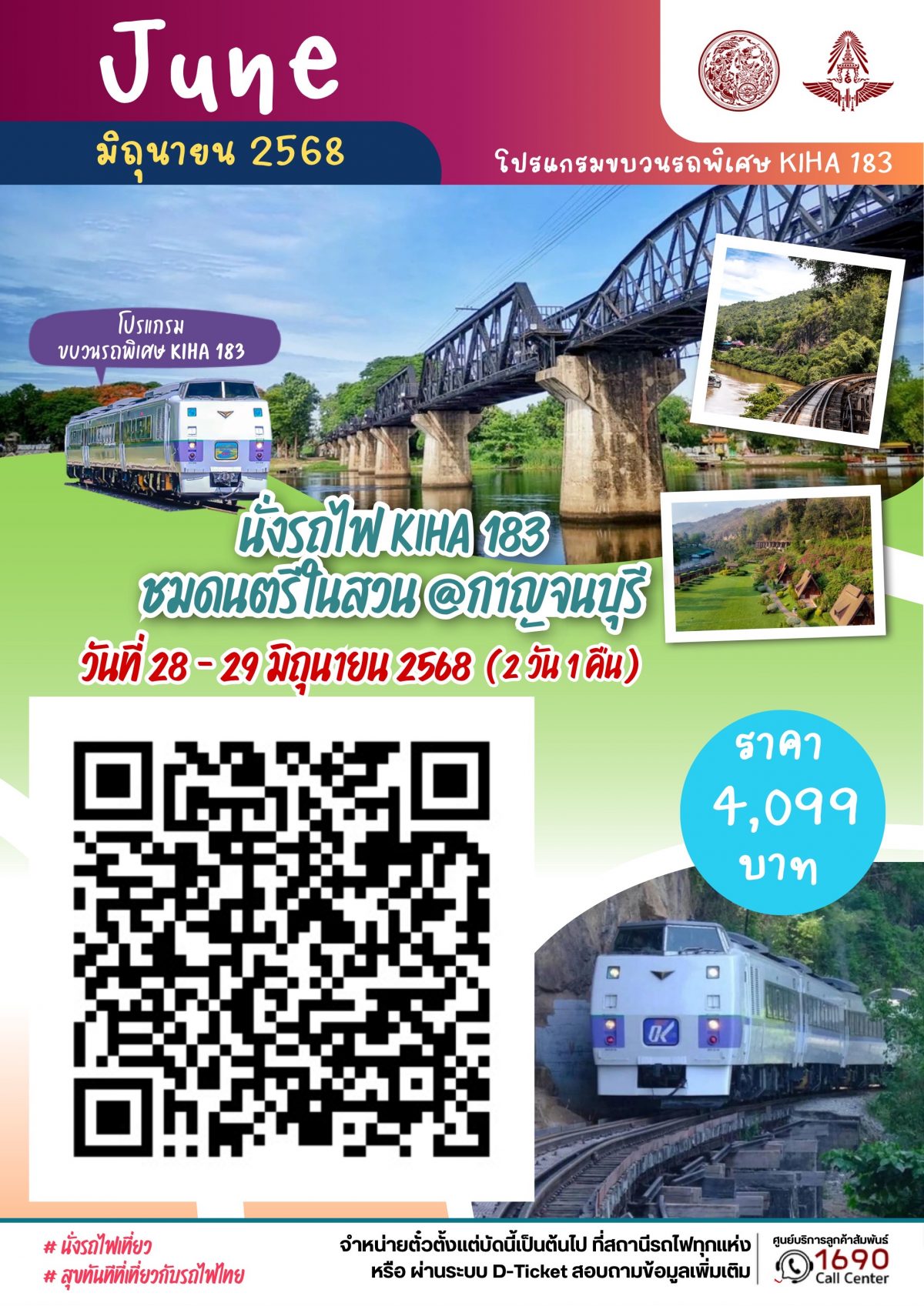 การรถไฟฯ ชวนนั่ง KIHA183 เที่ยวสไตล์แอดเวนเจอร์ ล่องแก่ง ผจญภัยเหนือสายน้ำ สนุกสนาน ปล่อยใจไปกับธรรมชาติ แบบพักค้างค้างคืน วันที่ 28 – 29 มิถุนายน 2568 ที่จังหวัดกาญจนบุรี ท่ามกลางบรรยากาศ ลำน้ำแควน้อยกับประวัติศาสตร์อันยาวนานสมัยสงครมโลกครั้งที่ 2