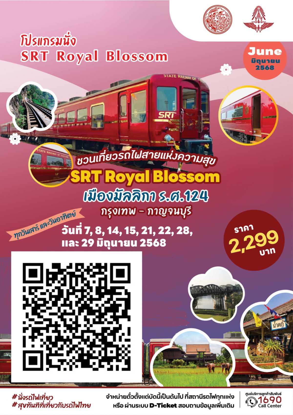 นอกจากนี้ตลอดเดือนมิถุนายน ยังมีขบวนรถไฟแห่งความสุข SRT Royal Blossom กับการเดินทางสไตล์แจ๊สและคาเฟ่บนรถไฟ พาเที่ยว “เมืองมัลลิกา ร.ศ.124” เส้นทางกรุงเทพ – กาญจนบุรี สัมผัสเสน่ห์เมืองตะวันตก ในเส้นทางทางรถไฟสายมรณะ หรือ ทางรถไฟสายประวัติศาสตร์ในสมัยสงครามโลกครั้งที่ 2 ที่นักท่องเที่ยวห้ามพลาด สนุกสนานกับการแสดง และจุดเช็กอินถ่ายภาพมากมาย ทุกวันเสาร์และอาทิตย์