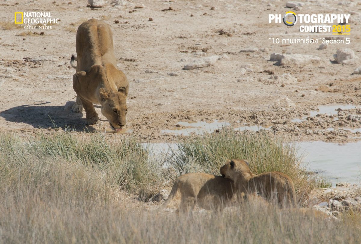 เมื่ออาหารมารวมตัวกันที่แอ่งนํ้า สัตว์ผู้ล่าก็ตามมาด้วยเช่นกัน แอ่งนํ้า Salvadora มีพุ่มหญ้าสูงริมนํ้าเหมาะแก่การซุ่มล่า แม่สิงโตพาลูกทั้งหกมาหลบอยู่ที่พุ่มหญ้าริมนํ้ารอจังหวะเหมาะเพื่อหาอาหารเย็นให้ครอบครัว