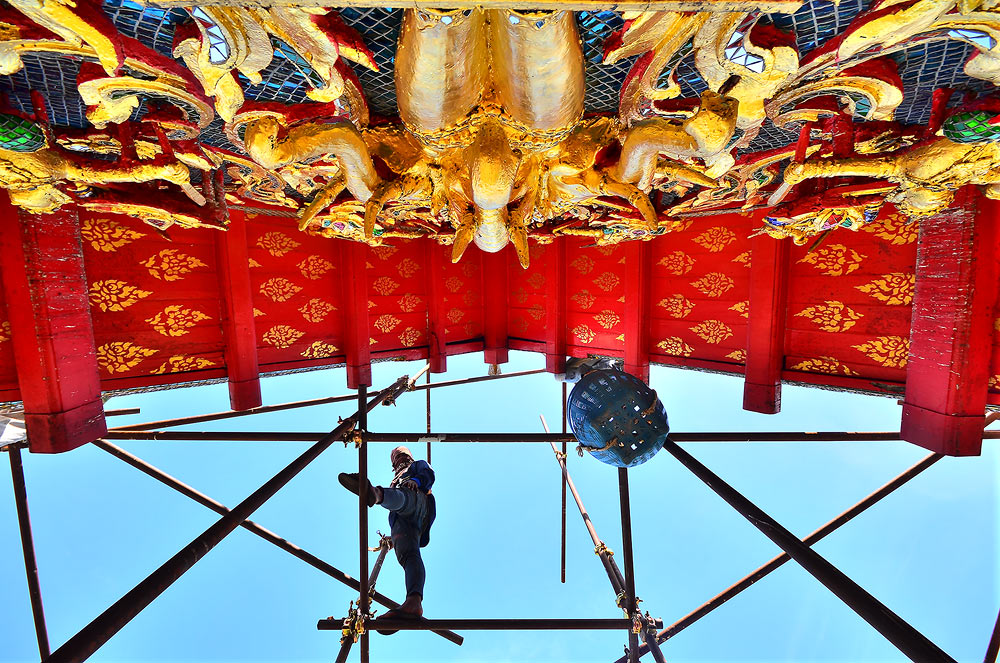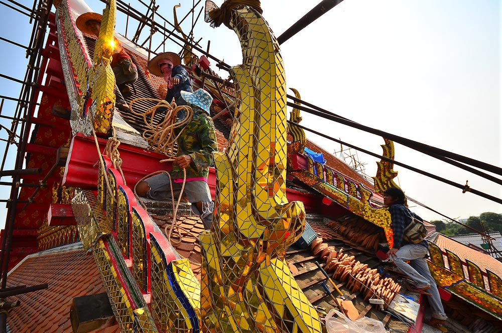 ผลกระทบของวาตภัยดังกล่าวส่งผลให้งานไม้แกะสลักประดับกระจกบนอุโบสถอายุกว่าร้อยปีพังลงมาบางส่วน เมื่อประเมินความเสียหายแล้วพบว่า ต้องรื้อของเก่าลงมา แล้วแกะของใหม่ขึ้นไปใส่แทนที่ ภารกิจนี้กลายเป็นการเดินทาง (ด้วยรถ) อันยาวไกลที่สุด และการ “เที่ยวทะเล” ครั้งแรกของเหล่าช่างไม้ชาวเหนือที่มากอบกู้พุทธศิลป์ไม้แกะสลักช่างสิบหมู่ที่หลงเหลือ อยู่ของปักษ์ใต้