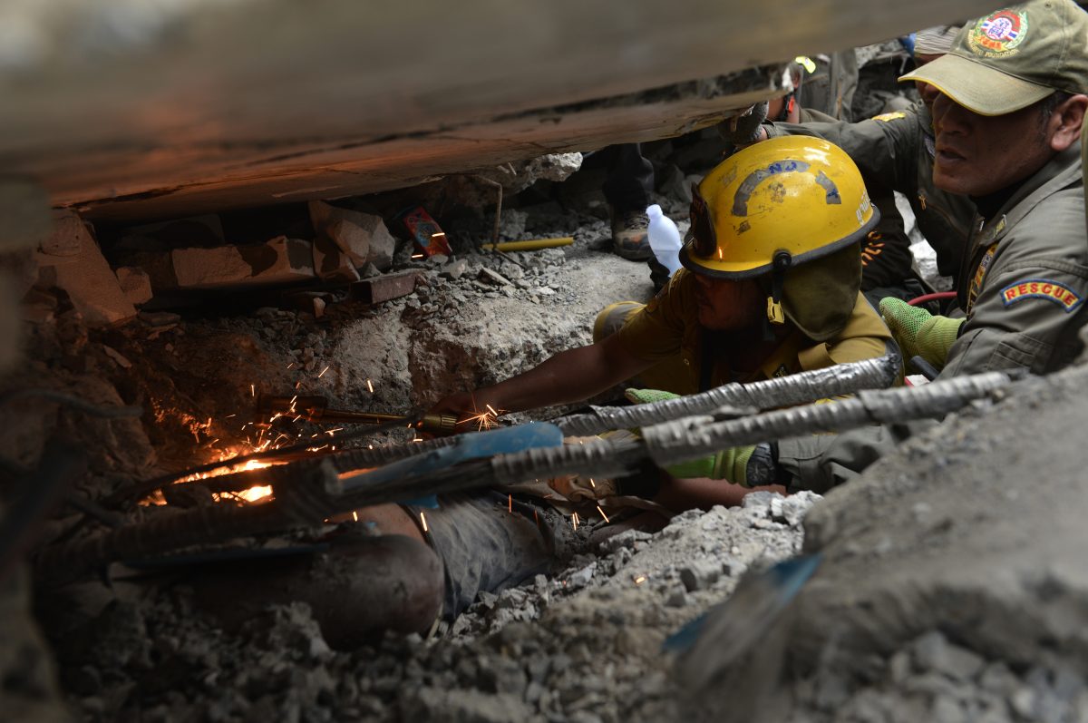 เจ้าหน้าที่กู้ภัยและทีมอาสาสมัครกำลังเร่งกู้ร่างผู้เสียชีวิตรายนี้จากเหตุการณ์ตึกถล่มทับคนงานก่อสร้างหลังจากที่พยายามยื้อชีวิตของเขามากว่า 19 ชั่วโมง