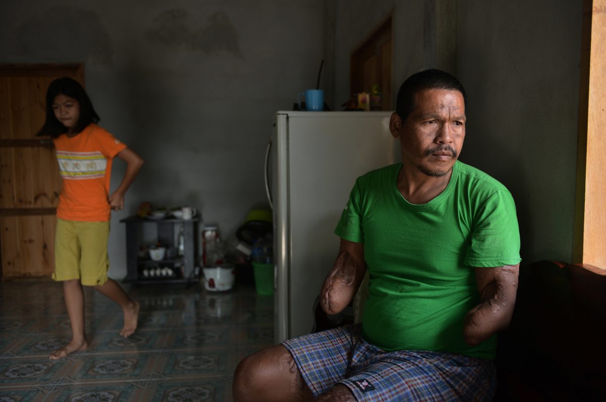 นายตุ๋ย สมสุข อายุ 42 ปี อดีตแรงงานก่อสร้างผู้ประสบอุบัติเหตุไฟฟ้าช็อตขณะทำงานจนต้องตัดแขนทั้งสองข้างกลายเป็นคนพิการและใช้ชีวิตอย่างยากลำบากโดยมีลูกสาววัย 12 ปี คอยดูแลเขามาตั้งแต่ประสบเหตุ