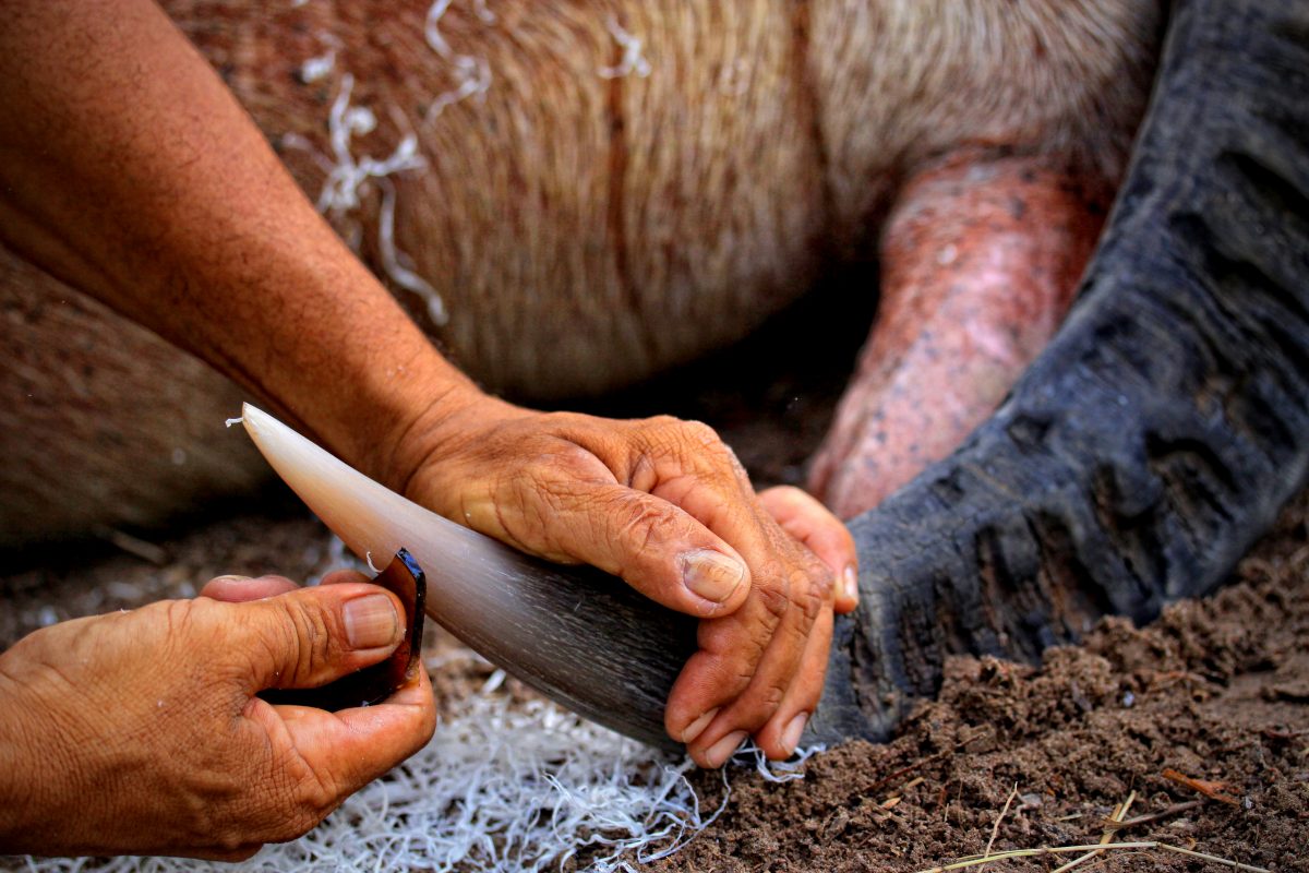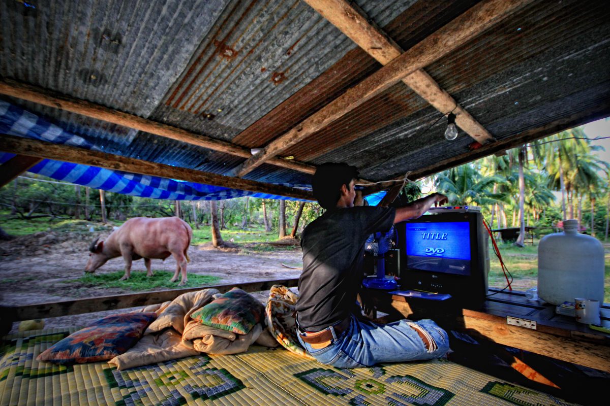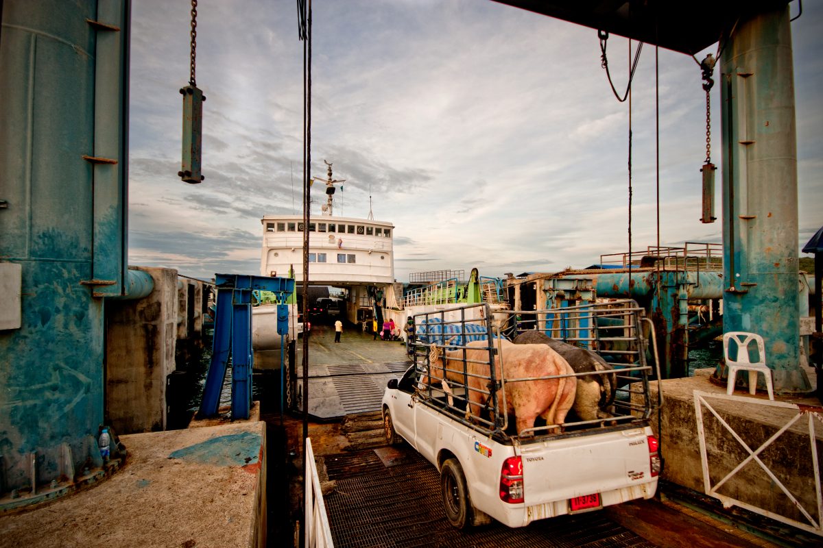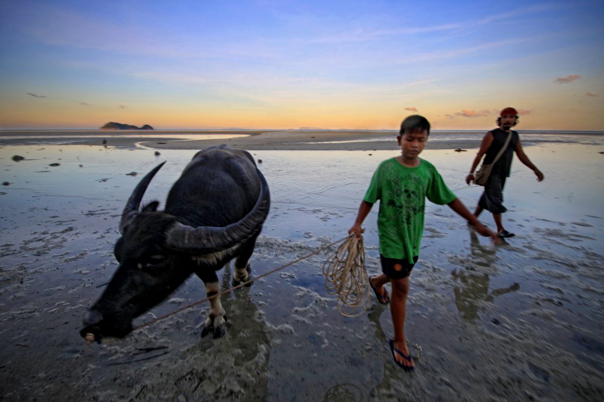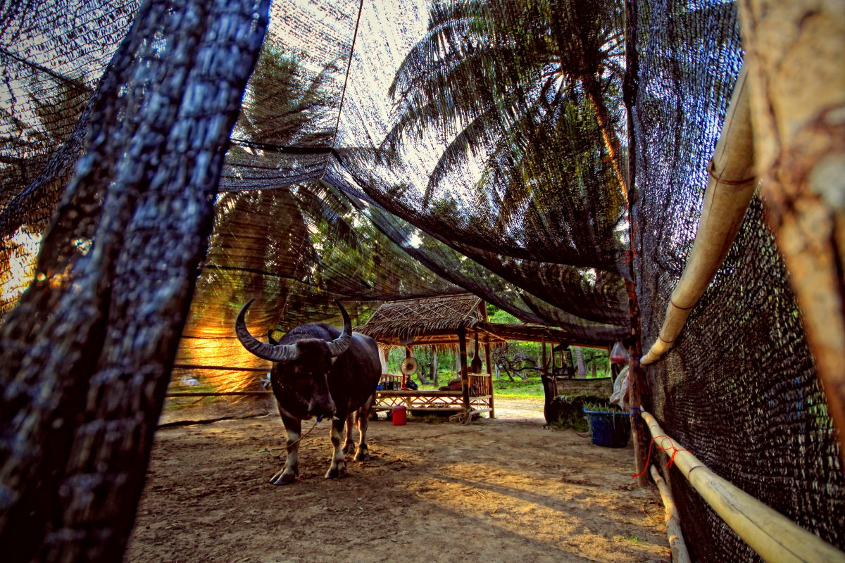 6. หลังจากเสร็จในช่วงสายๆ ก็จะทำการพาควายกลับยังที่พัก ลับเขา อาบน้ำ ให้อาหาร ซึ่งอาหารก็จะเป็นจำพวกหญ้าสด บริเวณยอดอ่อน โดยจะมีทีมคนดูแลที่มีหน้าที่ก็จะต้องออกไปตระเวณรอบเกาะหาตัดมาให้ทุกวัน หลังจากนั้นก็จะล่ามควายแล้วเด็กเลี้ยงควายก็จะพักผ่อน