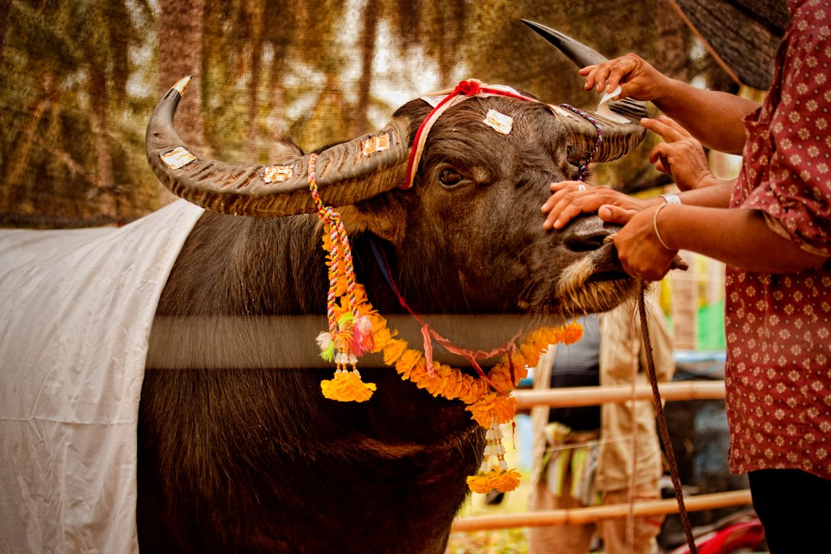 8. ในวันแข่งขันประมาณบ่ายสามโมง จะทำการล้างควาย ถอดเครื่องแต่งตัวควาย และนำควายเข้าสนาม โดยการนำควายเข้าสนามจะต้องดูทิศของหลักปักควายในสนาม ซึ่งขึ้นกับวัน ในบริเวณสนามหรือลูกในจะมีผ้าขาวกั้นกลางแบ่งเป็นสองฝั่ง เพื่อกันไม่ให้ควายเห็นกันก่อนที่จะชน