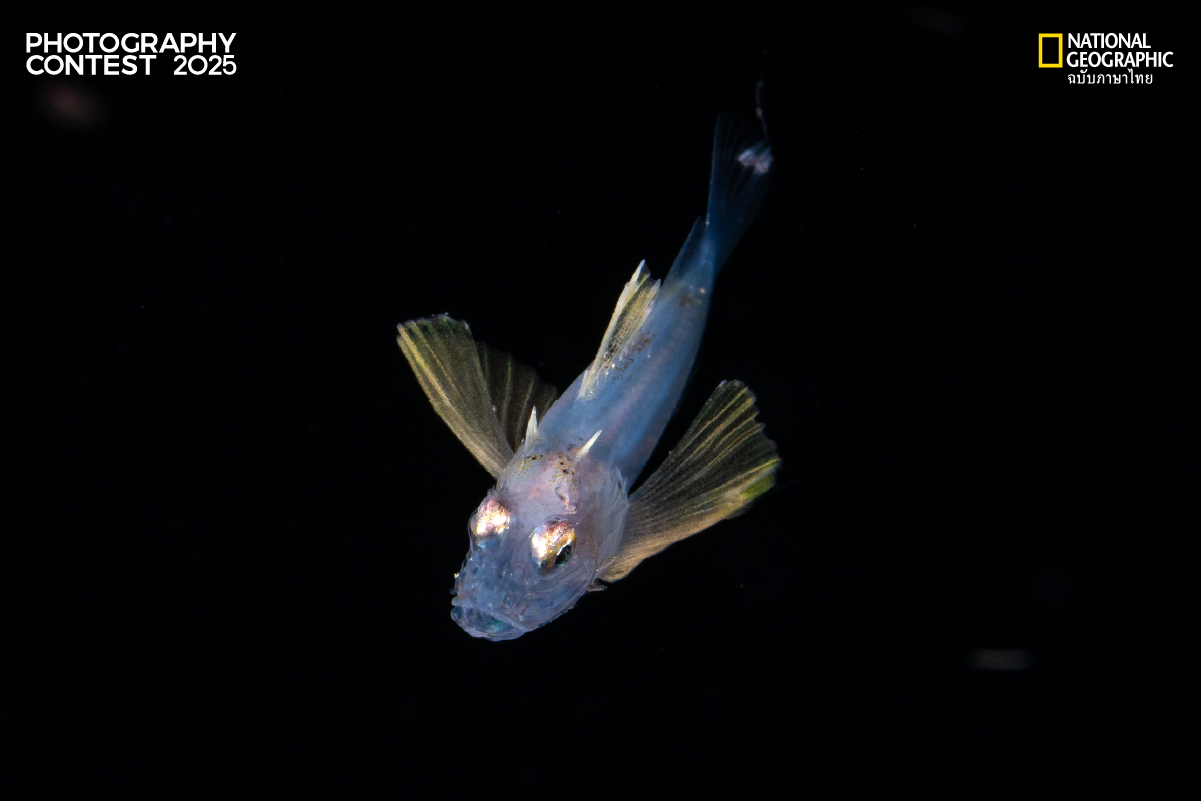 นี่คือโฉมหน้าวัยเยาว์ของปลาแมงป่อง (Scorpionfish Larva) ก่อนที่มันจะแปลงโฉมเป็นนักซุ่มโจมตีตามพื้นทราย ครีบอกที่กางแผ่สง่างามนี้คือเครื่องมือที่ช่วยให้มันใช้ชีวิตรอดในฐานะแพลงก์ตอน ก่อนจะถึงเวลาเติบใหญ่และเปลี่ยนบทบาทไปตลอดกาล