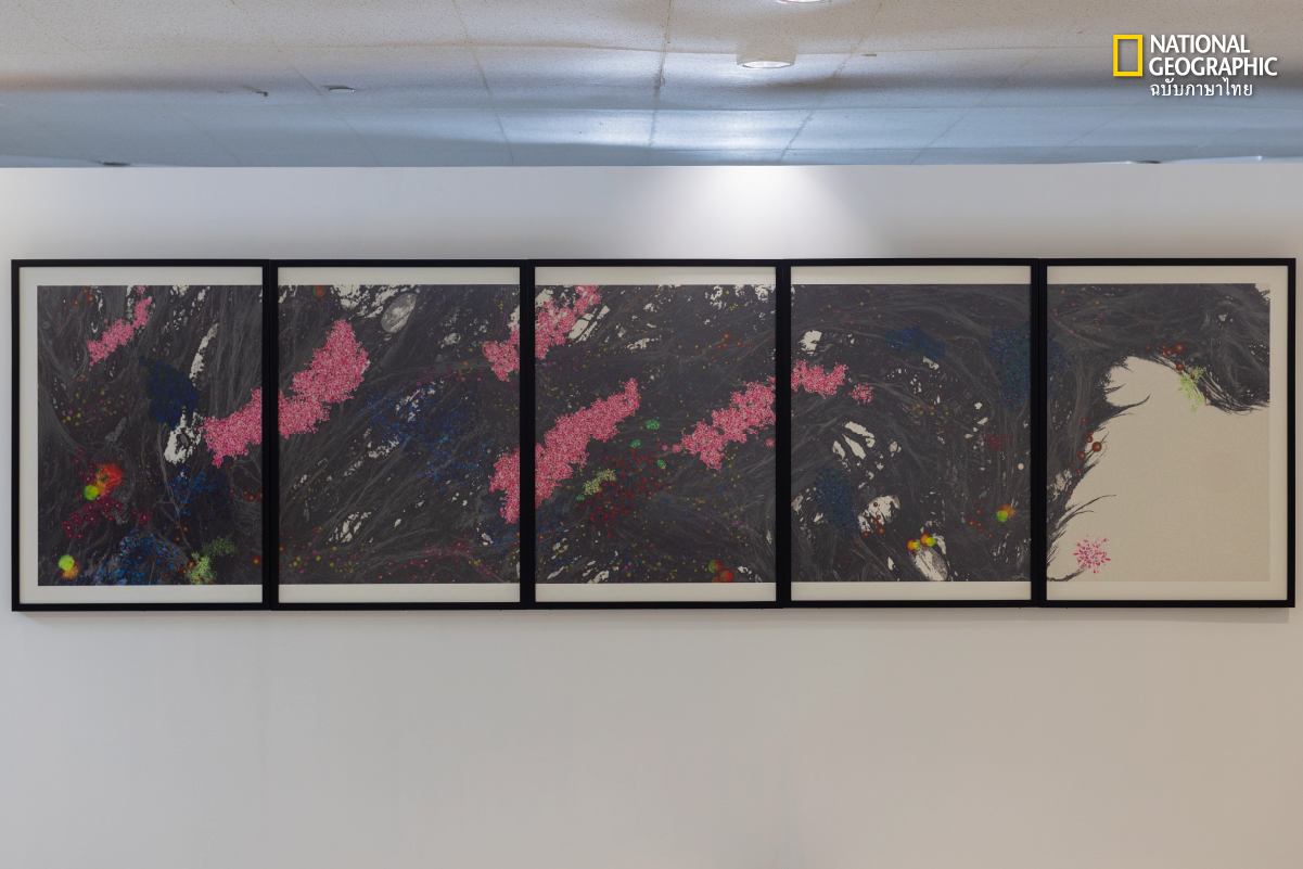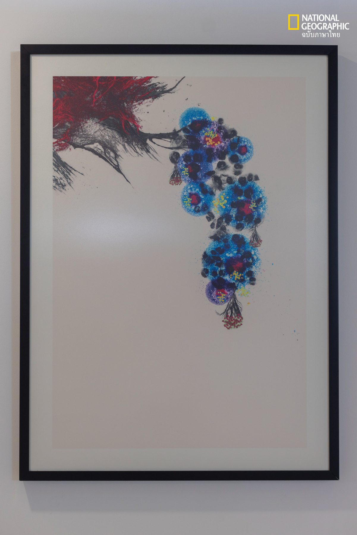 ซึ่งทุกภาพที่นำเสนอนั้น ศิลปินได้เลือกเก็บรายละเอียดของ “เซลล์มะเร็ง” และ “T-cell” ที่ปรากฏในภาพด้วยสีสันสดใส ในขณะที่ส่วนของเนื้อเยื่ออวัยวะรอบข้างถูกย้อมให้มีโทนสีดำ เพื่อให้เซลล์มะเร็งถูกแปลงร่างเป็นดอกไม้ดูโดดเด่นขึ้น ท่ามกลางความมืดมนของความเจ็บป่วยที่โอบล้อมอยู่รอบตัว
