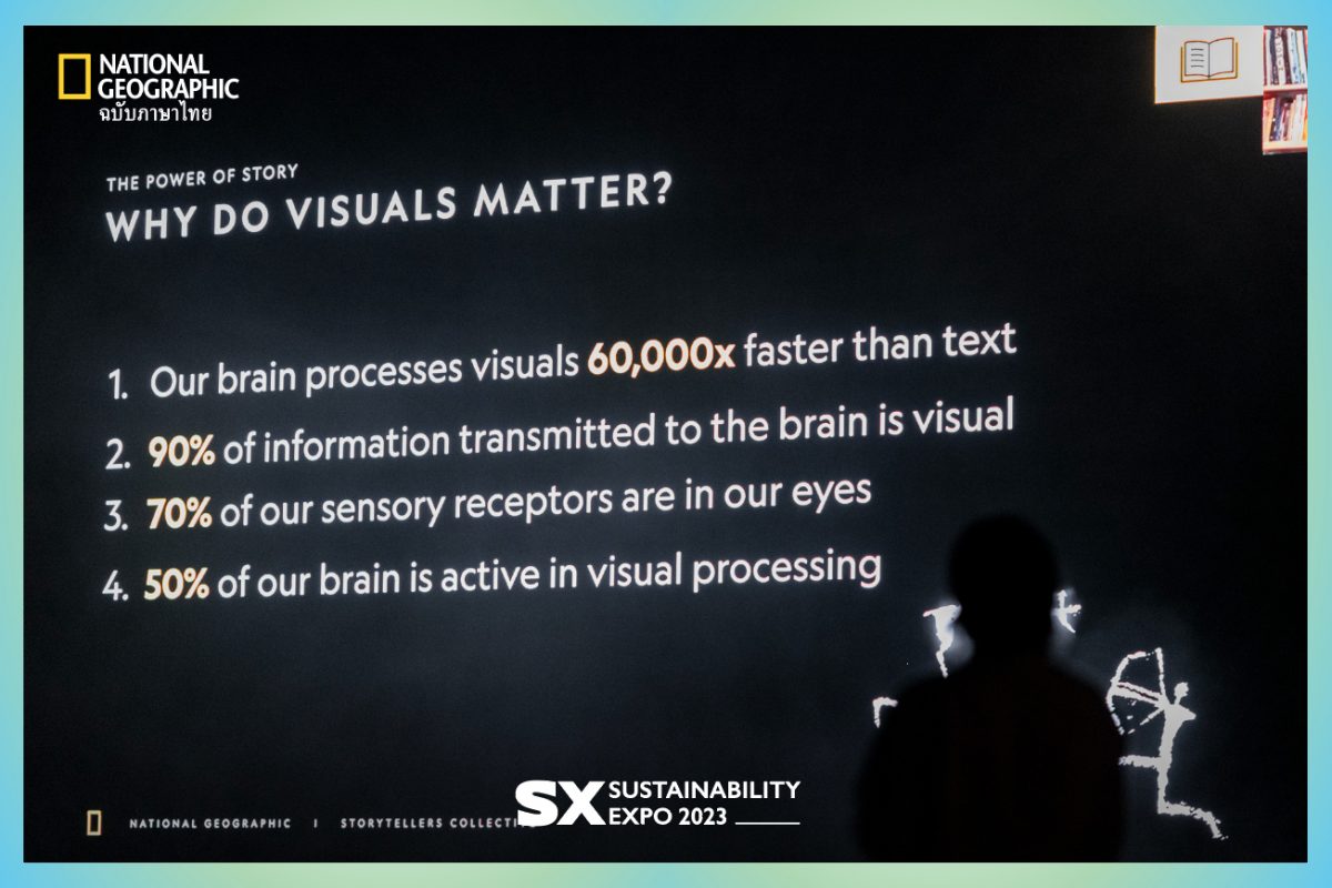 “สิ่งที่สำคัญของเรื่องเล่าที่ดีคือการมีภาพ (Visuals) ที่ดี เพราะ สมองของมนุษย์ประมวลผลภาพได้เร็วกว่าข้อความถึง 60,000 เท่า และ 90 % ของข้อมูลที่ส่งไปยังสมองนั้นเป็นภาพ ขณะที่ 70% ของตัวรับความรู้สึกอยู่ในดวงตา ซึ่งนั่นอธิบายว่าทำไม ภาพที่ดี จึงเสริมการเล่าเรื่องได้อย่างไม่มีที่ติ”