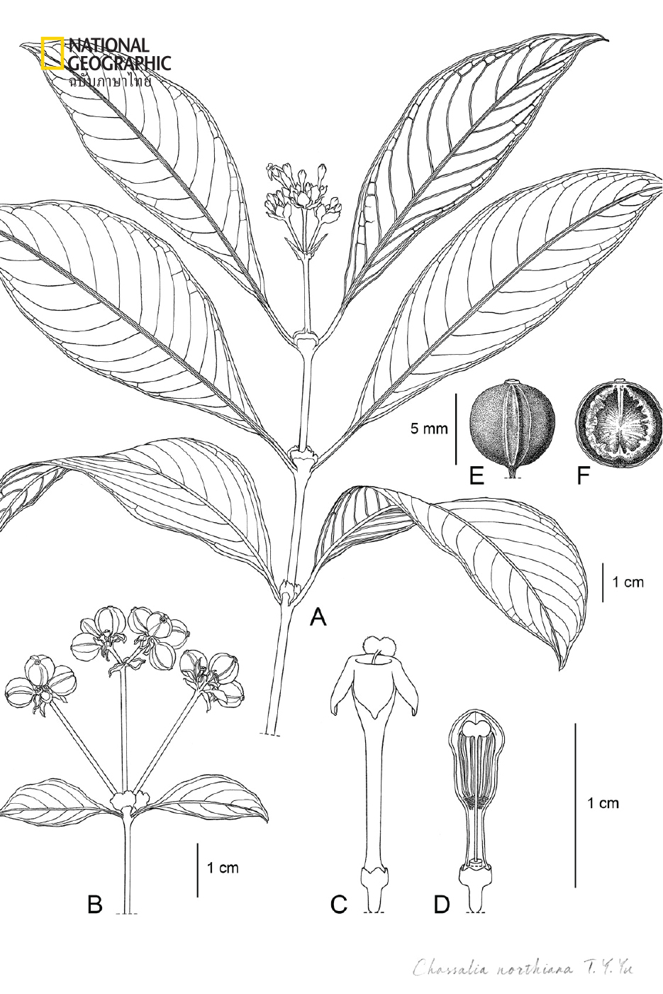 ภาพผลไม้สีฟ้าวาดโดยแมเรียน นอร์ธ ในปี ค.ศ. 1876 ที่นำไปสู่การค้นพบพืชชนิดใหม่ Chassalia northiana ภาพวาดทางพฤกษศาสตร์แสดงลักษณะของพืชชนิดนี้ โดย Tianyi Yu ที่มาภาพ: https://www.kew.org/read-and-watch/marianne-north-borneo-coffee