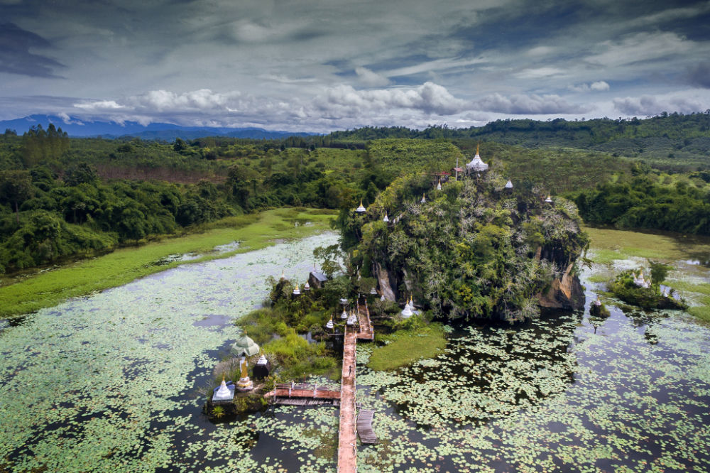 “หมู่บ้านโบอ่อง” ชุมชนกลางน้ำที่ตั้งอยู่กลางเขื่อนวชิราลงกรณ (เขื่อนเขาเเหลม) หรือเขื่อนหินแห่งแรกของประเทศไทย ซึ่งการเดินทางต้องนั่งเรือเข้าไป ชุมชนที่นี่มีพี่น้องกะเหรี่ยงอยู่ร่วมกัน สร้างเรือนแพเป็นที่อยู่อาศัยอย่างเรียบง่ายและเงียบสงบ ทั้งยังถือเป็นดินแดนเเห่งความศักดิ์สิทธิ์ ใจกลางหมู่บ้านมีพระธาตุโบอ่อง เจดีย์แบบพม่า อายุกว่า 200 ปี ตั้งตระหง่านบนยอดเขาที่ล้อมรอบด้วยบึงบัว สถานที่นี้ถือเป็นศูนย์รวมจิตใจของชาวชุมชนที่เชื่อกันว่าขอพรสิ่งใดก็จะสมปรารถนาทุกประการ