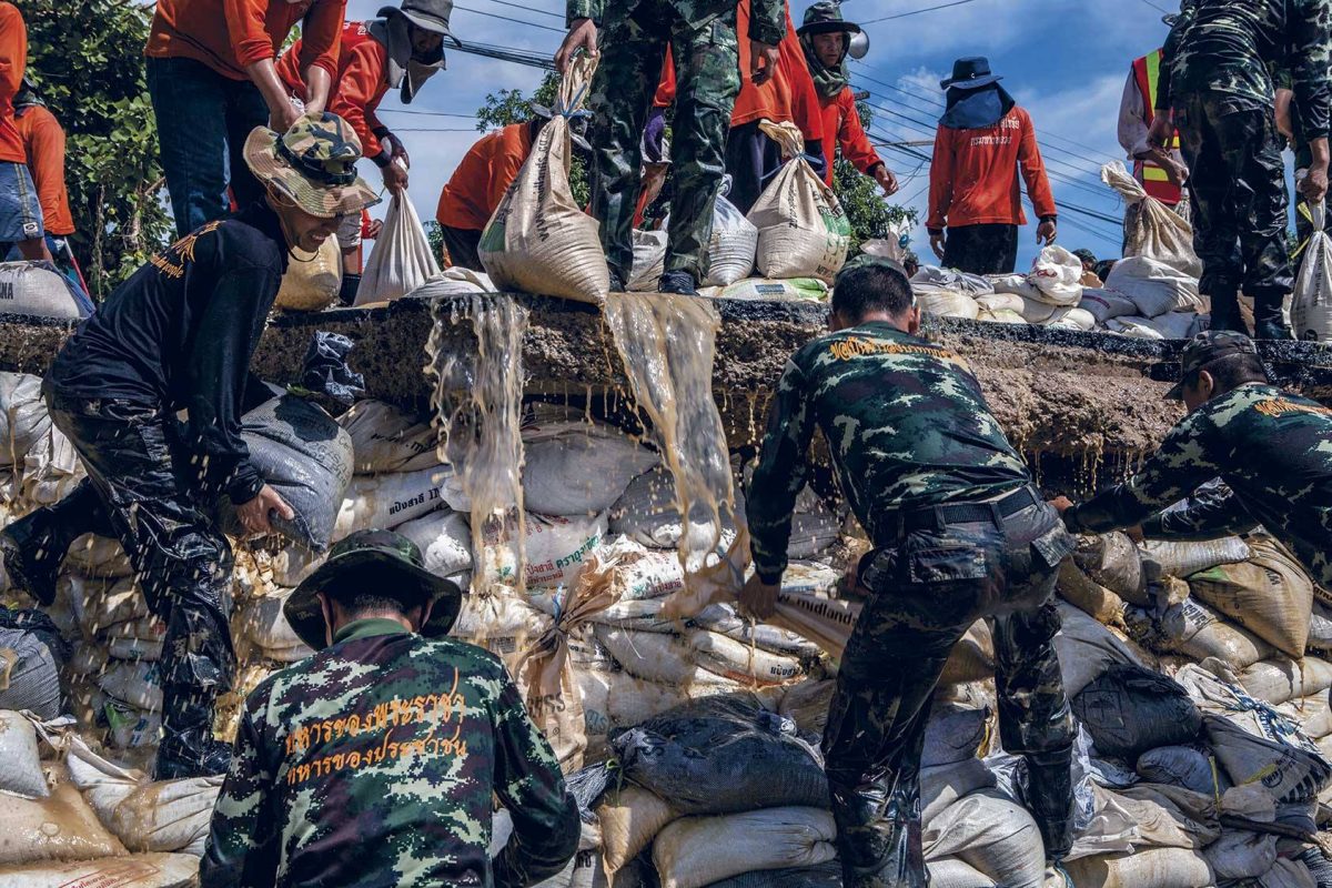 ทุกวันนี้ สองฟากแม่นํ้าเจ้าพระยาขนาบด้วยคันกั้นนํ้าสูง 2.7 เมตร ยาวกว่า 70 กิโลเมตร และต้องเสริมให้สูงขึ้นทุกปี นักวิชาการเชื่อว่า อีกราว 30 ปีข้างหน้า คันกั้นนํ้าจะต้องสูงถึงห้าเมตรจึงจะพอปกป้องเมืองจากนํ้าท่วมได้