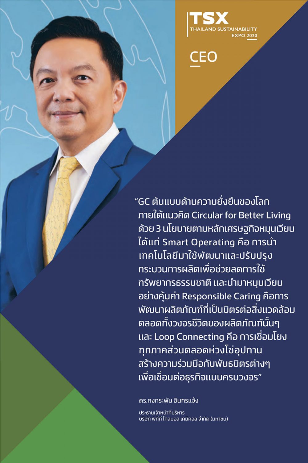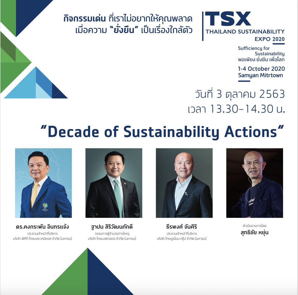 พบกับการเสวนาจากผู้บริหารสูงสุดของ 3 บริษัทชั้นนำ นำโดยคุณฐาปน สิริวัฒนภักดี กรรมการผู้อำนวยการใหญ่ บริษัทไทยเบฟเวอเรจ จำกัด, ดร.คงกระพัน อินทรแจ้ง ประธานเจ้าหน้าที่บริหาร บริษัทพีทีที โกลบอล เคมิคอล จำกัด และคุณธีรพงศ์ จันศิริ ประธานเจ้าหน้าที่บริหาร บริษัทไทยยูเนี่ยน กรุ๊ป จำกัด ในหัวข้อ ”Decade of Sustainability in Action” ดำเนินรายการโดย คุณสุทธิชัย หยุ่น