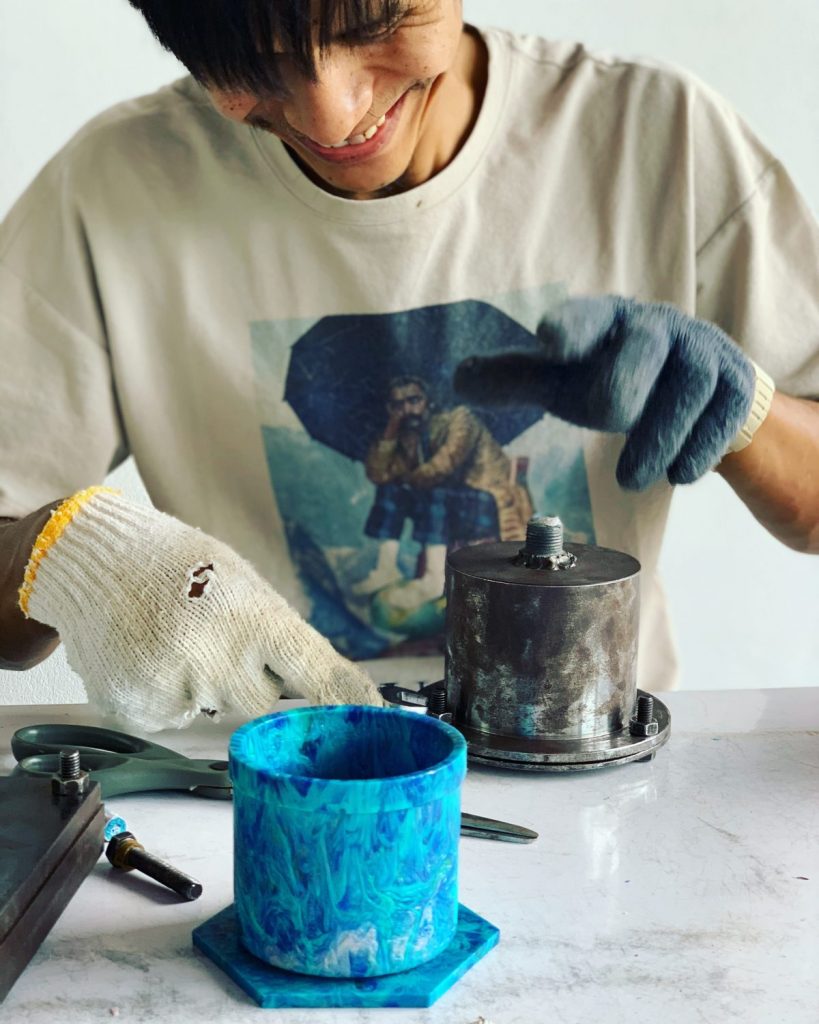 คุณเมย์เล่าว่า ในขั้นตอนนี้ ต้องรอให้ความร้อนหลอมพลาสติกเป็นเวลา 20 นาที “สำหรับการพิมพ์กระถางต้นไม้ ขนาดเส้นผ่าศูนย์กลาง 8 เซนติเมตร เราใช้ขยะพลาสติกราว 115 กรัม เมื่อครบตามเวลาที่ตั้งไว้แล้ว ก็ต้องออกแรงกันหน่อย ใช้สุดตัวดึงคันโยกลงมาให้สุด เพื่ออัดขยะพลาสติกให้แน่น พอขึ้นรูปเรียบร้อยแล้ว เราค่อยนำกระถางต้นไม้ออกจากแป้นพิมพ์ ขั้นตอนนี้กระถางจะร้อนมากนะคะ แต่ยังมีความนุ่ม ถ้าอยากเจาะตรงไหนให้รีบทำเลย จากนั้น แค่รอให้กระถางเซตตัว ก็เป็นอันเสร็จค่ะ”