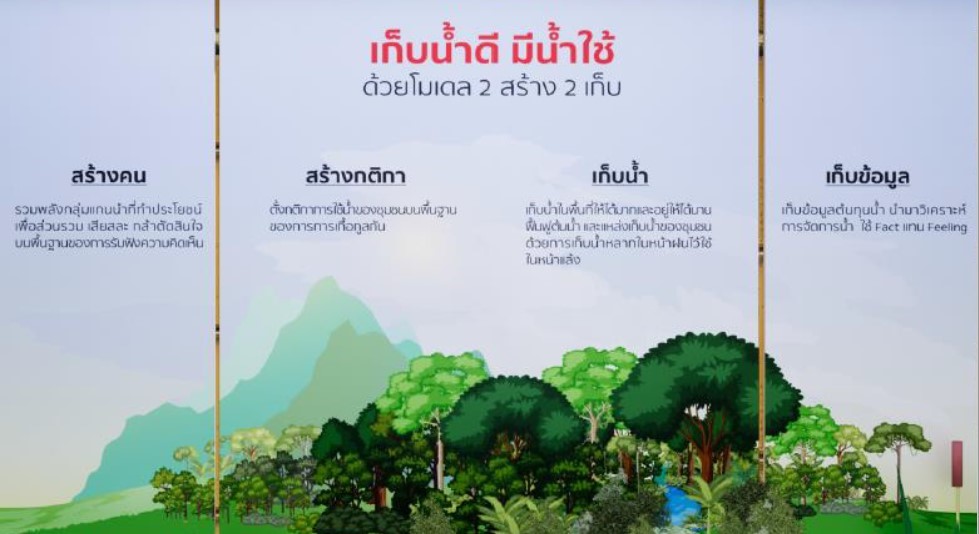 โดย 6 วิธีการบริหารจัดการน้ำ เป็นการสร้างระบบการจัดการแหล่งน้ำในรูปแบบที่เชื่อมต่อกันจากพื้นที่ป่าชาวบ้านสู่พื้นที่ทำสวนและอยู่อาศัยแบบองค์รวม ที่นอกจากทำให้ชุมชนได้รับประโยชน์ในการมีน้ำใช้อย่างเพียงพอไปตลอดทั้งปีแล้ว ยังเป็นการส่งเสริมให้ชุมชนเป็น “นักวิจัยท้องถิ่น” ซึ่งเป็นผลจากการที่ เอสซีจีซี ทำงานร่วมกับชุมชนในพื้นที่ในการนำเอาหลักการทางวิทยาศาสตร์มาให้คำแนะนำในการประยุกต์ใช้ ร่วมกับภูมิปัญญาชาวบ้านดั้งเดิมเพื่อแก้ปัญหาในพื้นที่ ส่งเสริมขีดความสามารถในการใช้ประโยชน์จากน้ำและที่ดินที่มีอยู่ให้เกิดประโยชน์สูงสุด ทำให้ชาวบ้านเกิดความภาคภูมิใจในการสร้างระบบจัดการน้ำเพื่อสร้างผลผลิตทางการเกษตรในระดับที่ต้องการซึ่งจะส่งผลต่อคุณภาพชีวิตที่ดีด้วยตัวเอง ส่งเสริมความรู้สึกรักและหวงแหนในท้องถิ่น อันจะทำให้ธรรมชาติและระบบนิเวศในพื้นที่อุดมสมบูรณ์ น้ำ ป่า และคน จึงสามารถอยู่ร่วมกันได้อย่างยั่งยืน
